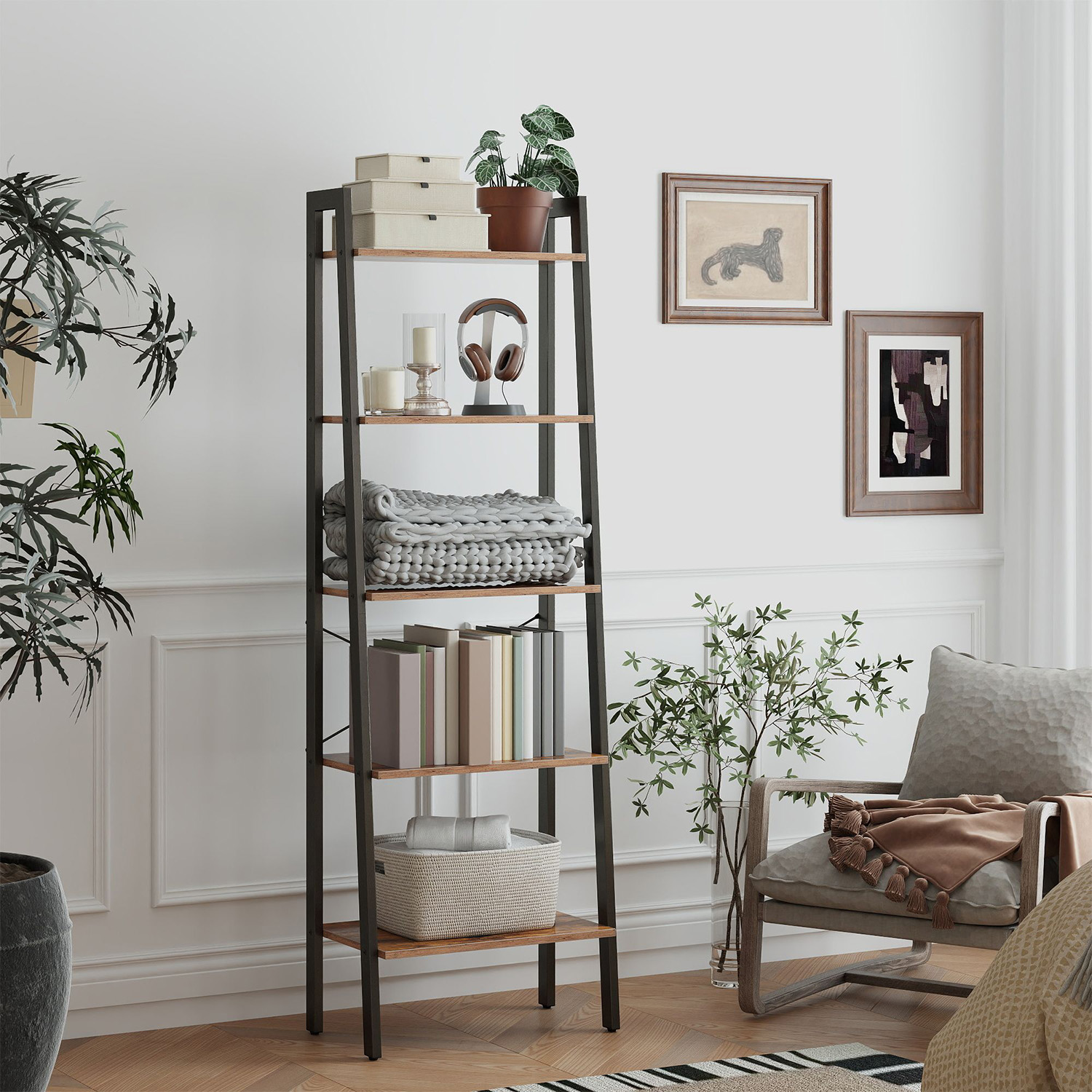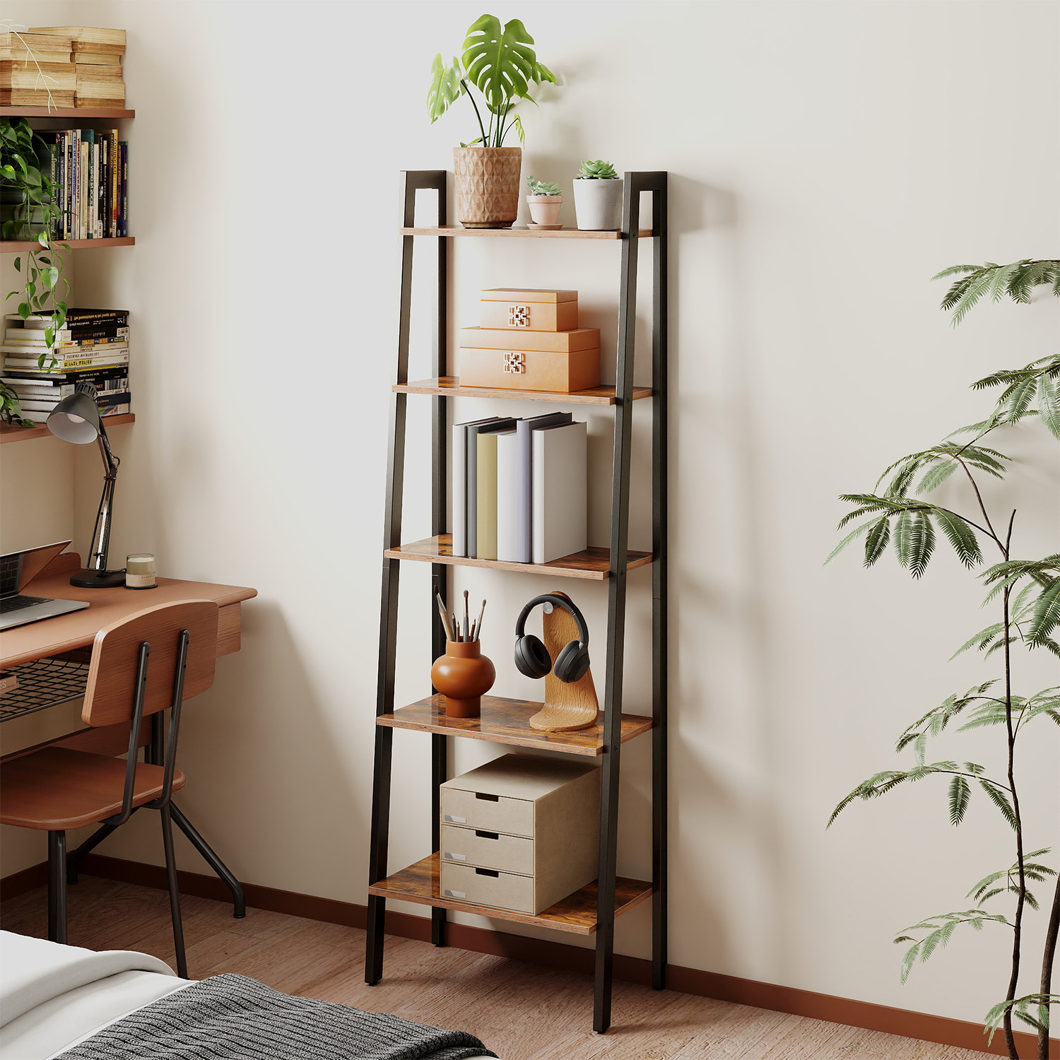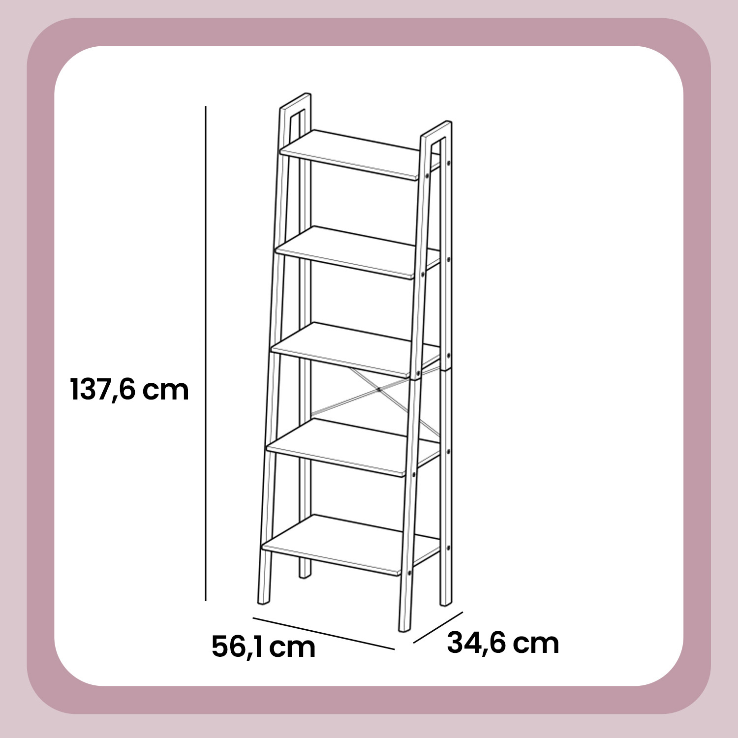 Ši kompaktiška ir funkcionali 5 pakopų lentyna padeda optimaliai išnaudoti turimą erdvę ir suteikia daug vietos daiktams laikyti. Joje patogiai telpa knygos, dekoracijos, augalai, virtuvės reikmenys ar kiti kasdieniai daiktai, todėl ji tinka įvairiems kambariams – nuo svetainės iki darbo kambario ar virtuvės.