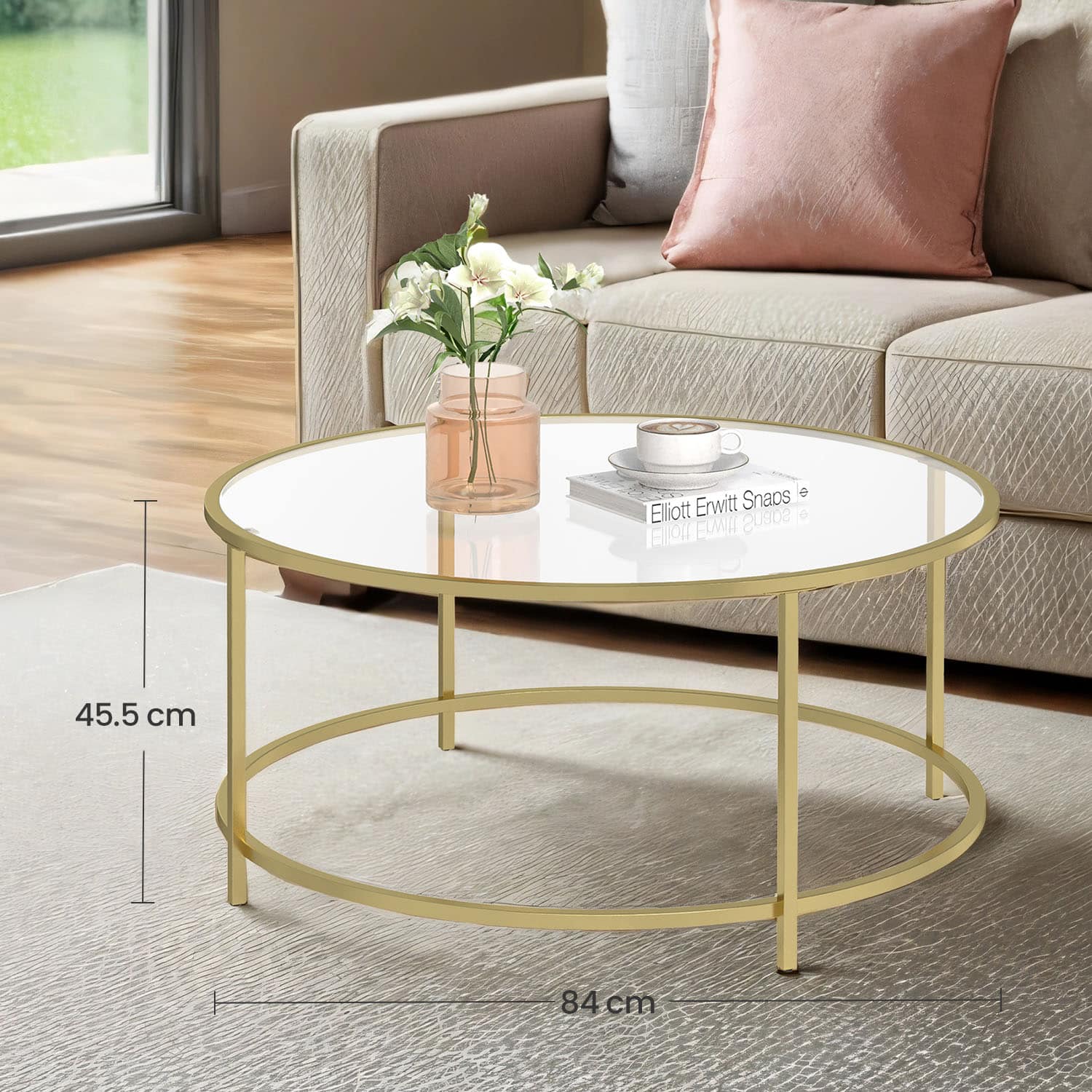 Auksiniai laikai jūsų svetainėje: Įneškite elegancijos ir šilumos su šiuo apvaliu kavos staliuku. Jo aukso spalvos rėmas ir grūdinto stiklo stalviršis sukuria rafinuotą, tačiau modernų įvaizdį.