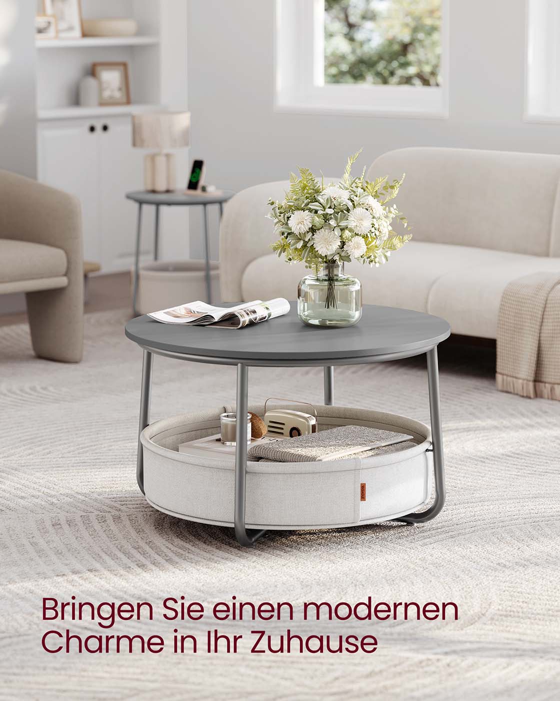 Šis modernus apvalus kavos staliukas taps praktišku ir stilingu jūsų svetainės akcentu. 75 cm skersmens ir 45 cm aukščio stalas suteikia pakankamai vietos kavos puodeliui, užkandžiams, dekoracijoms ar darbo reikmenims. Po stalviršiu integruotas kreminės spalvos audinio krepšys pasižymi net 57,7 litro talpa, todėl lengvai susitvarkysite su kasdienių daiktų laikymu – nuo antklodžių ir pagalvių iki knygų ar žurnalų.