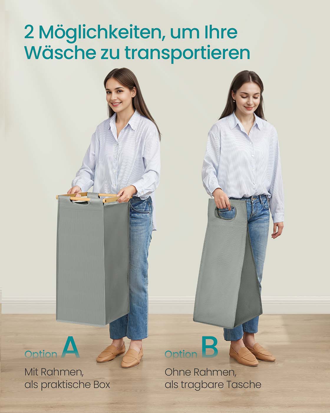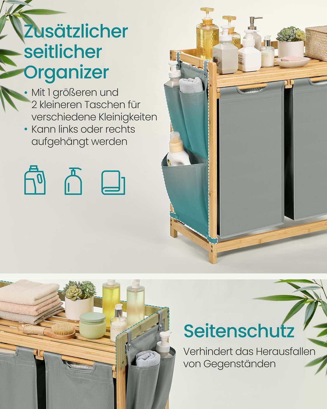Ši funkcionali ir estetiška vonios spintelė su 3 atskirais skalbinių skyriais leidžia lengvai rūšiuoti skalbinius pagal spalvą ar tipą. Kiekvienas skyrius talpina 50 litrų, bendra talpa – net 150 litrų. Viršutinė lentyna suteikia vietos skalbimo priemonėms ar vonios aksesuarams, o šoninės kišenės suteikia papildomos vietos smulkesniems daiktams. Tvirtas bambuko rėmas ne tik stabilus ir ilgaamžis, bet ir suteikia natūralų, jaukų akcentą jūsų vonios kambariui. Išimami skalbinių maišai su plastikine pagrindo plokšte išlaiko formą, nesilanksto ir turi patogius lipdukus, leidžiančius lengvai juos ištraukti ir pernešti tiesiai į skalbimo mašiną. Puikus pasirinkimas praktiškam ir tvarkingam vonios kambario organizavimui.