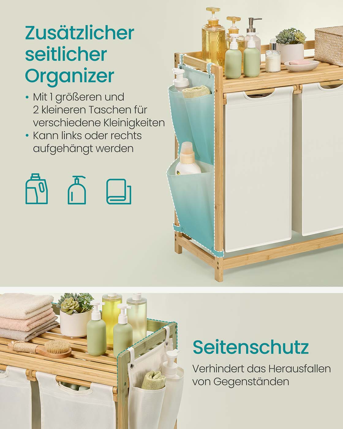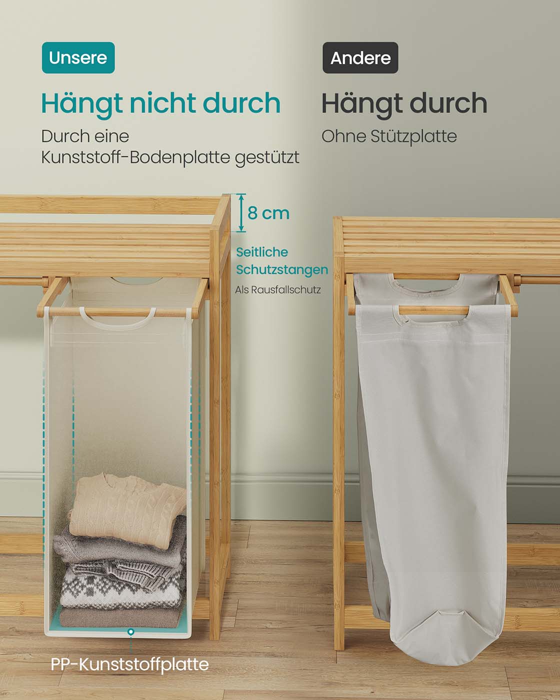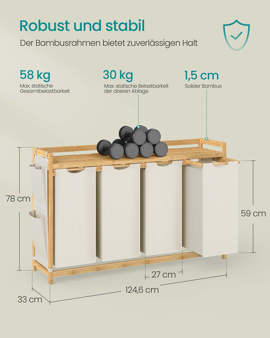 Tvirtas bambuko rėmas sukuria natūralų ir jaukų įspūdį interjere. Išimami maišai su plastikine pagrindo plokšte nesilanksto ir lengvai ištraukiami dėl lipdukų tvirtinimo. Konstrukcija stabili ir patvari, lentyna atlaiko iki 30 kg.