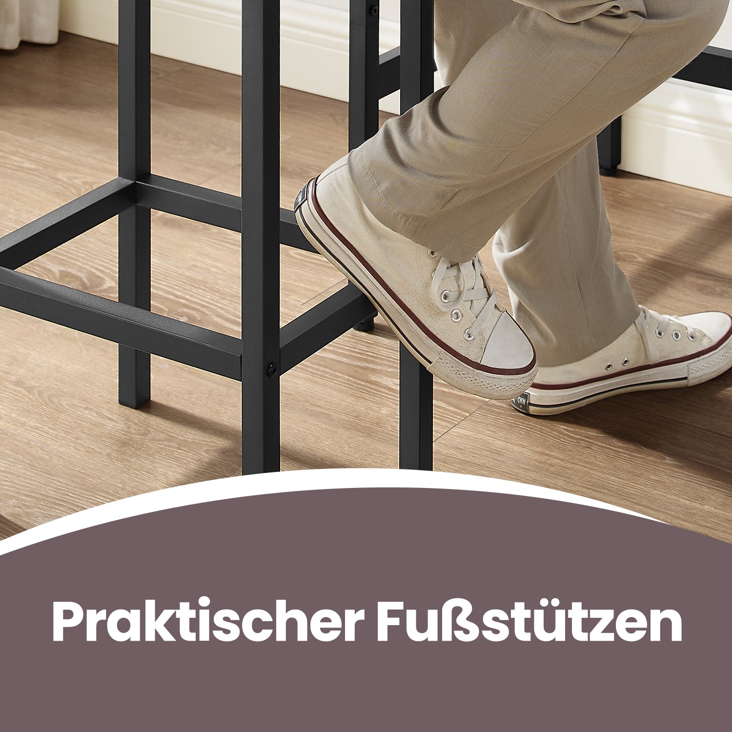 Kompaktiškas baro stalo komplektas su dviem taburetėmis – idealus pasirinkimas mažoms erdvėms. Elegantiškas juodos spalvos dizainas puikiai dera tiek prie modernaus, tiek industrinio interjero. Tinka įvairioms paskirtims – nuo jaukių vakarienių iki neformalių gėrimų ar net darbo vietos.