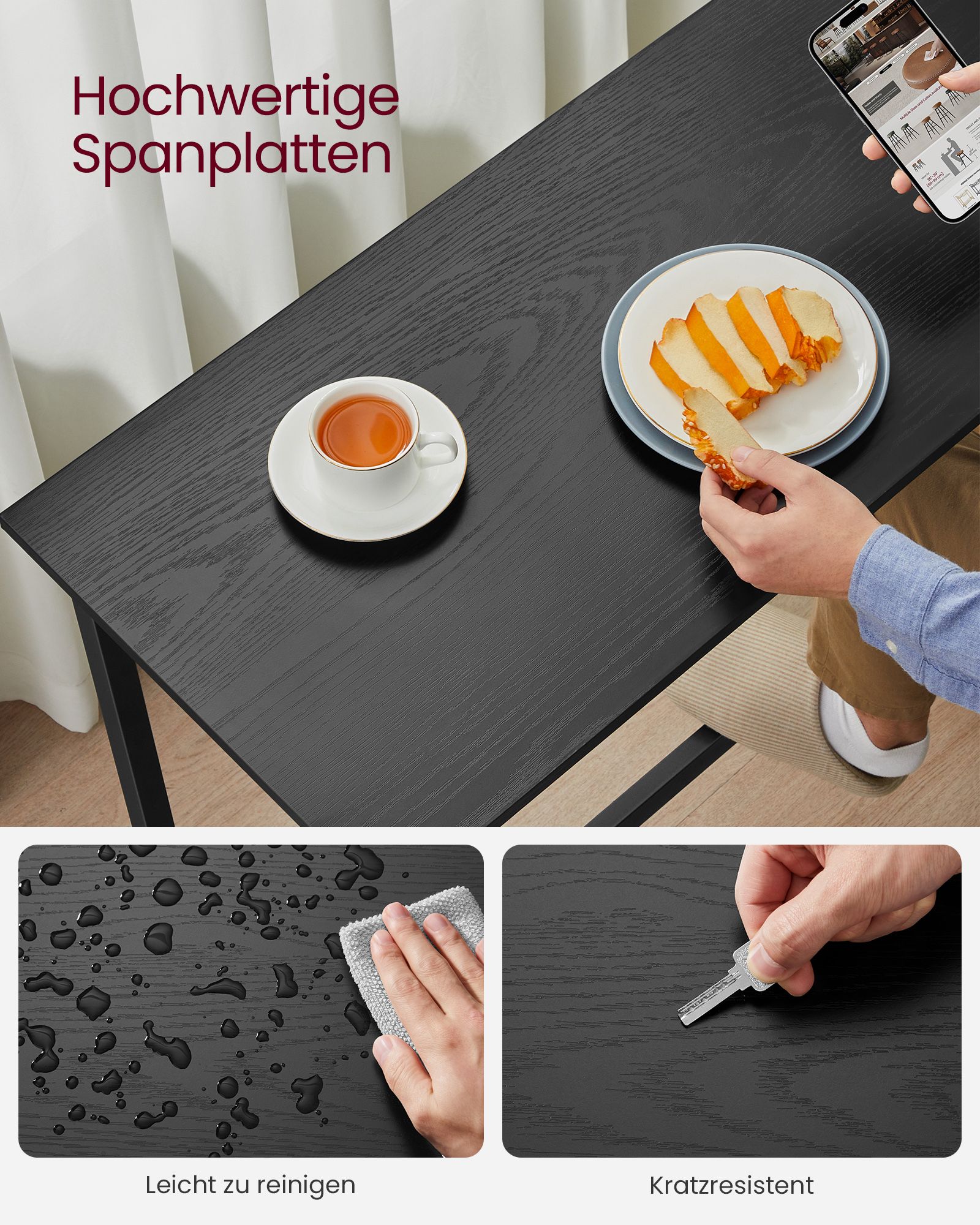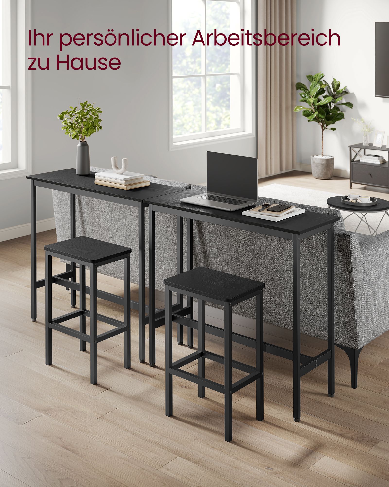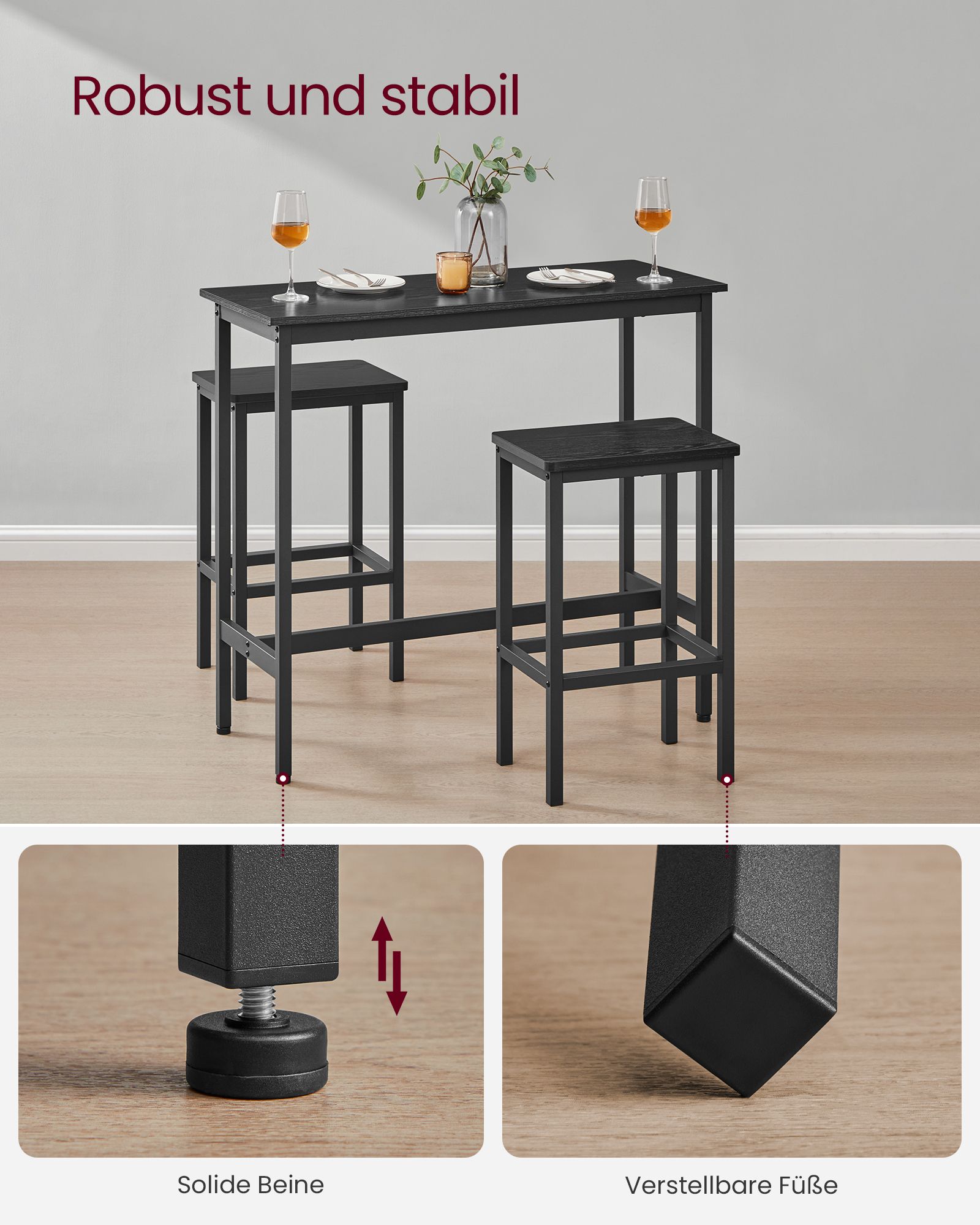 Kompaktiškas baro stalo komplektas su dviem kėdėmis – puikus sprendimas namų barui ar jaukiam pusryčių kampeliui. Juodos spalvos medžio drožlių plokštė ir metalinis rėmas sukuria modernų industrinio stiliaus įspūdį, o praktiškas dizainas leidžia taburetes paslėpti po stalu, kai jos nenaudojamos.