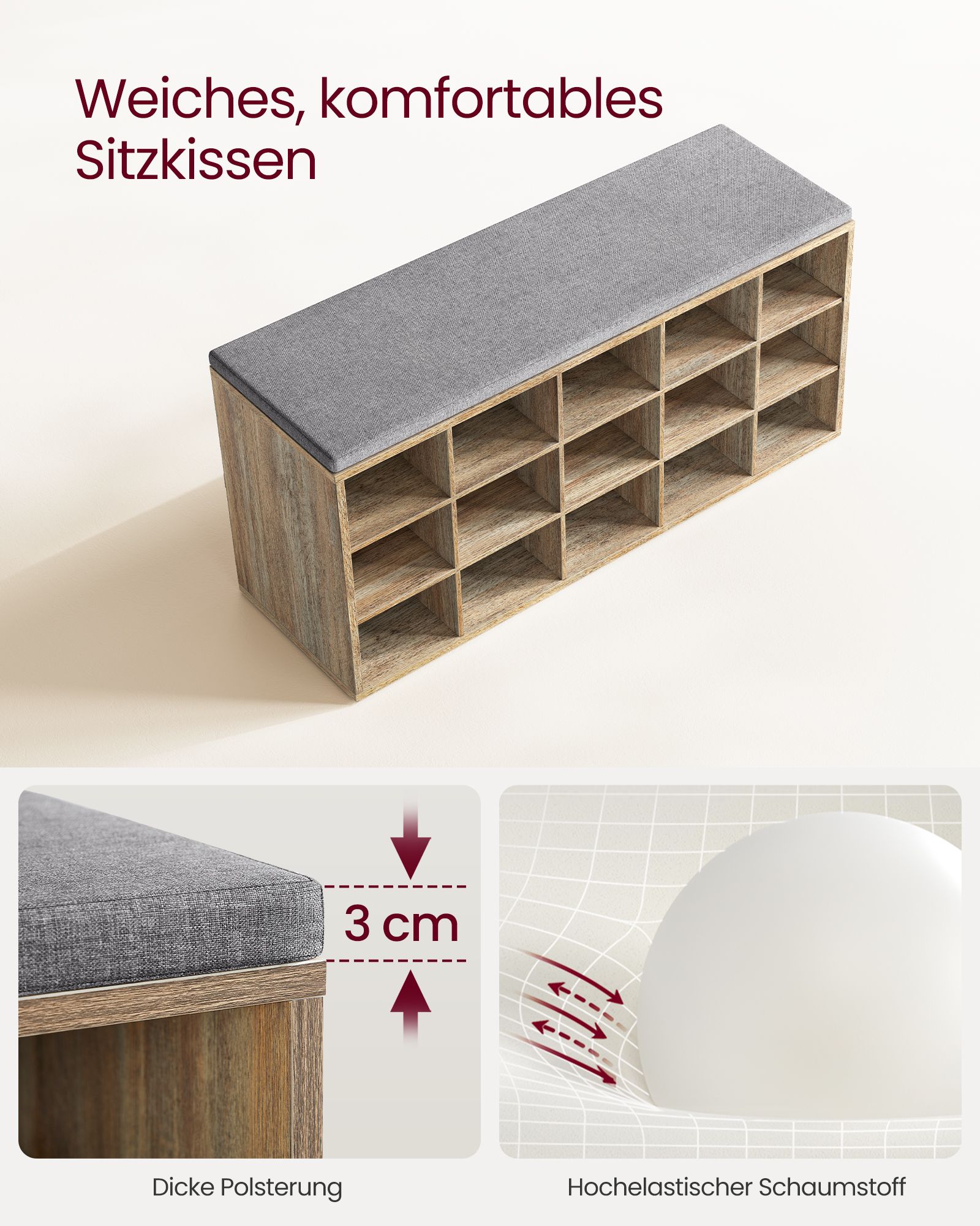 Tvirta ir stilinga batų lentyna su patogia sėdimąja dalimi – praktiškas sprendimas tvarkingam prieškambariui. Pagaminta iš 15 mm storio medžio drožlių plokštės, konstrukcija yra itin stabili ir gali atlaikyti iki 200 kg. Net 15 atvirų skyrių užtikrina, kad visi batai turės savo vietą, o 30 cm gylis leidžia patogiai laikyti ir didesnius, vyriškus modelius. Nuimama minkšta pagalvėlė su skalbiamu užvalkalu suteikia komfortą, o surinkimas yra paprastas dėl paženklintų dalių ir aiškių instrukcijų. Baldas puikiai tinka prieškambariui, svetainei ar miegamajam.