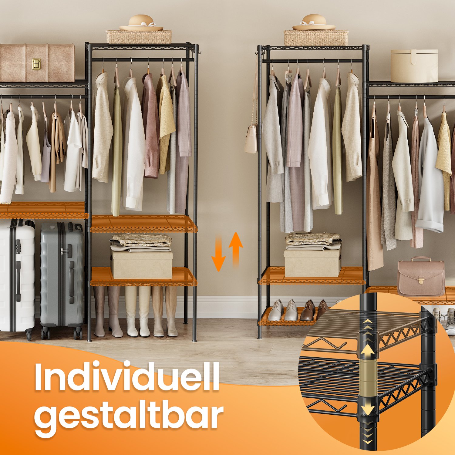 Strypai ir lentynos yra reguliuojami, todėl galite prisitaikyti erdvę pagal poreikius – tinka tiek ilgiems paltams, tiek kaip dviguba spinta skirtingiems daiktams.
