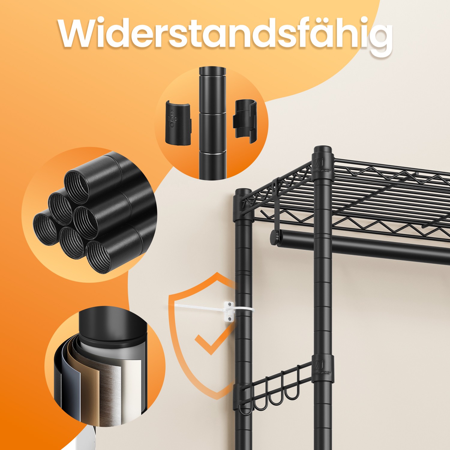 Ši atvira metalinė spinta sujungia funkcionalumą ir elegantišką juodos spalvos dizainą. Keturi kabinimo strypai ir aštuonios lentynos užtikrina pakankamai vietos drabužiams, avalynei, aksesuarams ar dėžėms laikyti.