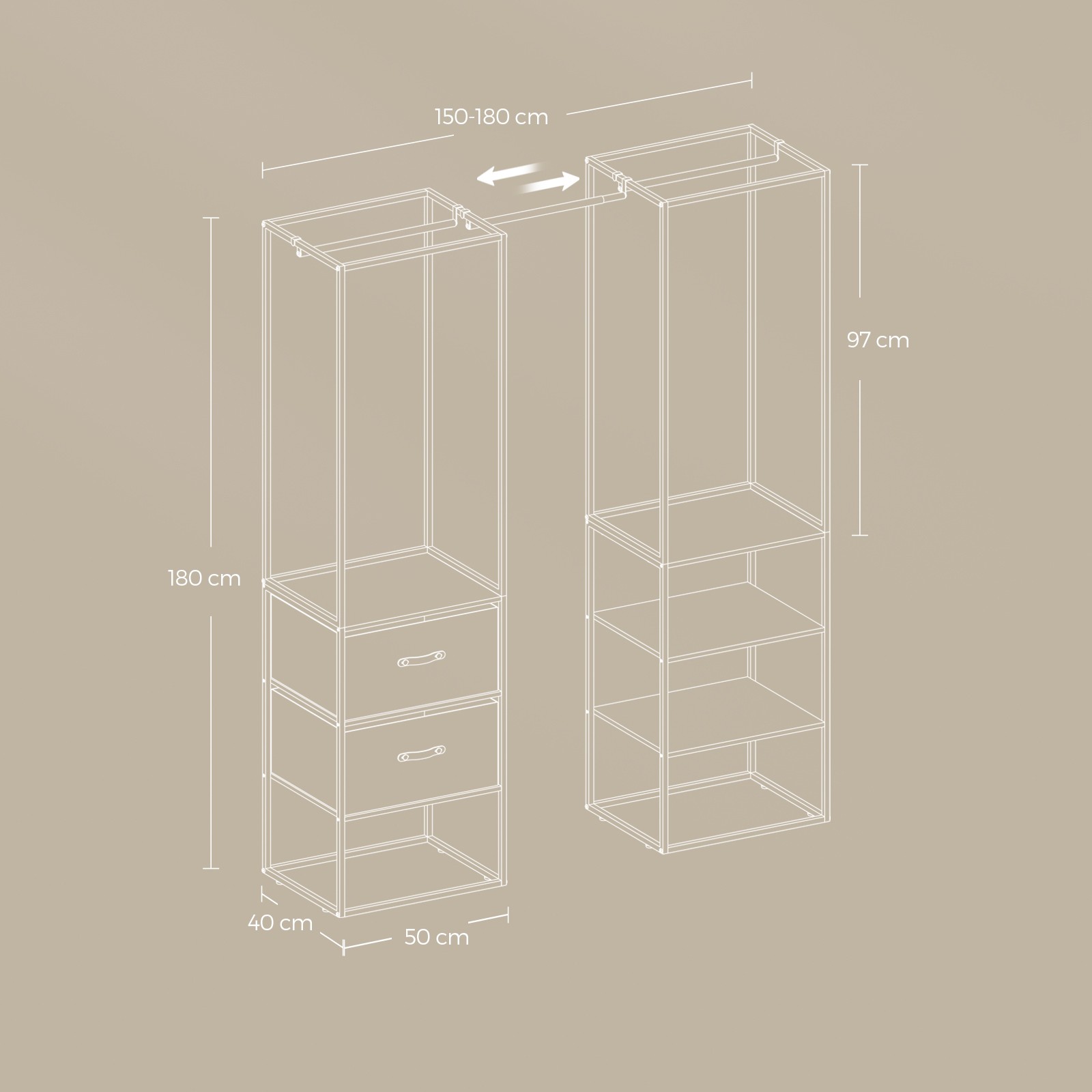 Ši universali drabužių kabykla suteikia daug vietos ir funkcionalumo įvairių drabužių bei aksesuarų laikymui. Konstrukcijoje yra 2 fiksuoti drabužių skersiniai, 1 ištraukiamas strypas, 2 audinių stalčiai ir 4 lentynos – viskas, ko reikia marškiniams, paltams, kelnėms, batams, krepšiams ar lagaminams laikyti vienoje vietoje. Tvirtas plieninis rėmas ir storos MDF plokštės užtikrina stabilumą ir ilgaamžiškumą, o iš viso 130 kg keliamoji galia leidžia patogiai organizuoti net sunkesnius daiktus. Kabyklos dizainas kompaktiškas ir lengvai pritaikomas skirtinguose kambariuose – miegamajame, skalbykloje ar persirengimo kambaryje. Surinkimas paprastas, nes visos dalys pažymėtos, o instrukcija aiški ir iliustruota.