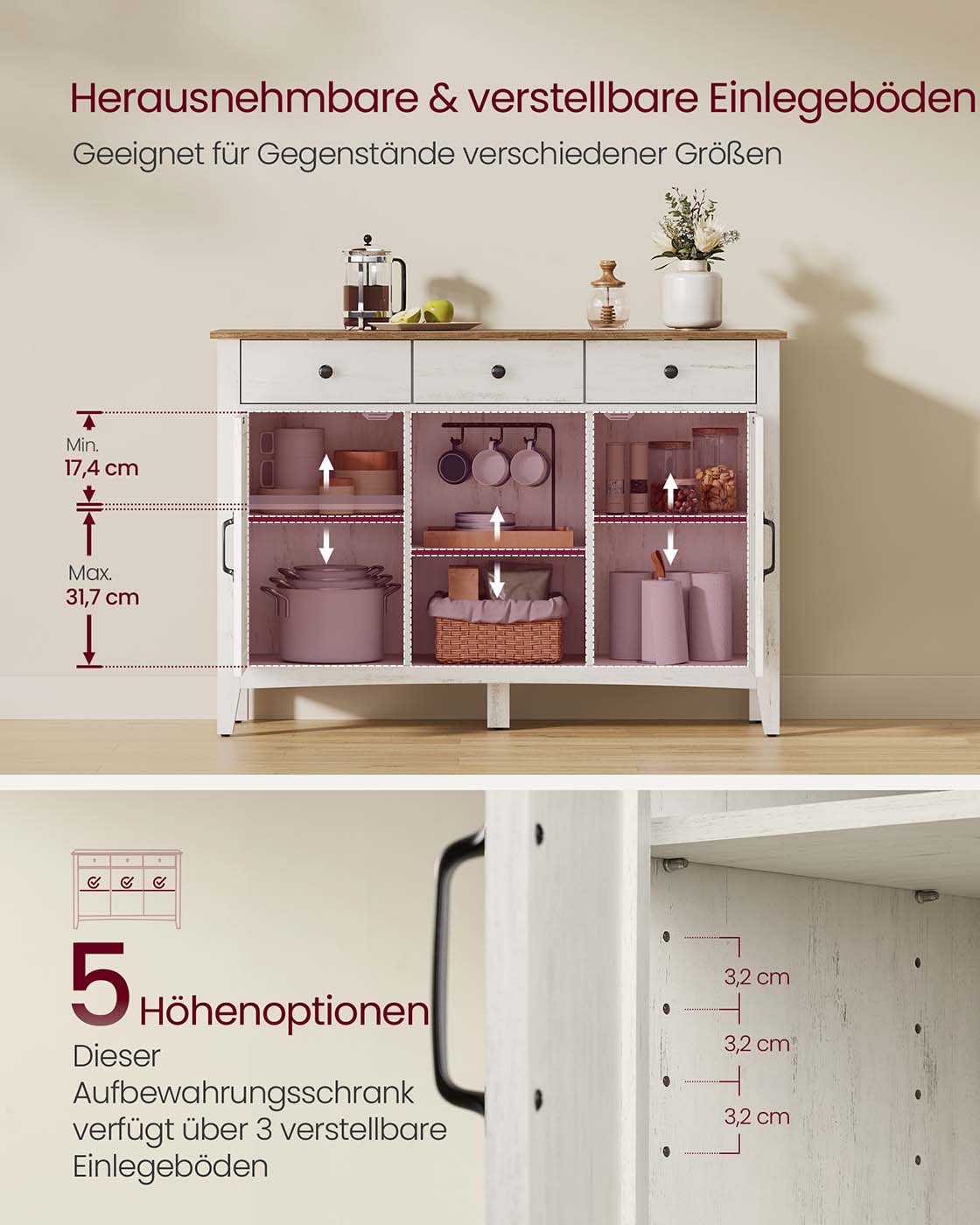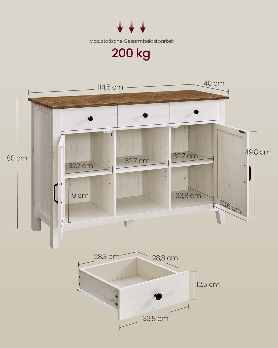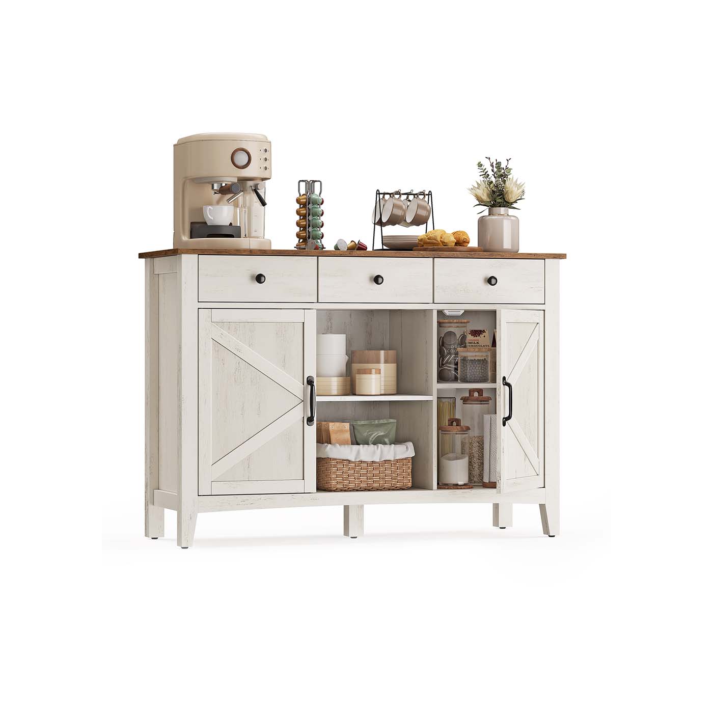 Ši kaimiško stiliaus indauja derina funkcionalumą su autentišku dizainu – puikus pasirinkimas tiems, kurie nori jaukumo ir praktiškumo viename balde. Baltos ir rudos spalvų kontrastas, dekoratyvios durelės ir aukštos kojelės suteikia baldui elegancijos, o 3 stalčiai, atviros lentynos ir uždaros spintelės leidžia tvarkingai laikyti viską – nuo smulkmenų iki indų. Reguliuojama lentyna, pertvaros ir laidų angos padeda prisitaikyti prie jūsų poreikių, o stabilumą užtikrina tvirta konstrukcija bei apsauga nuo apvirtimo.