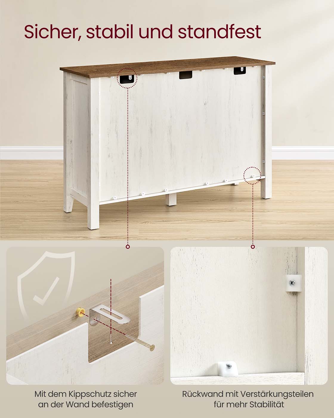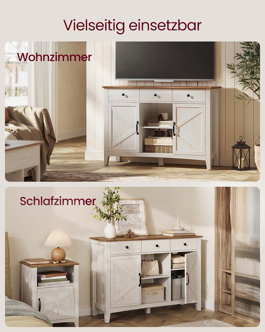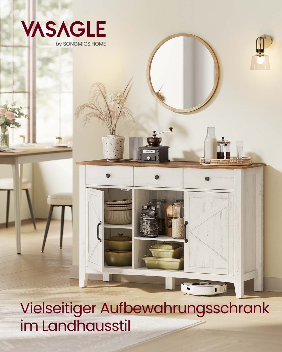 Ši kaimiško stiliaus indauja derina funkcionalumą su autentišku dizainu – puikus pasirinkimas tiems, kurie nori jaukumo ir praktiškumo viename balde. Baltos ir rudos spalvų kontrastas, dekoratyvios durelės ir aukštos kojelės suteikia baldui elegancijos, o 3 stalčiai, atviros lentynos ir uždaros spintelės leidžia tvarkingai laikyti viską – nuo smulkmenų iki indų. Reguliuojama lentyna, pertvaros ir laidų angos padeda prisitaikyti prie jūsų poreikių, o stabilumą užtikrina tvirta konstrukcija bei apsauga nuo apvirtimo.