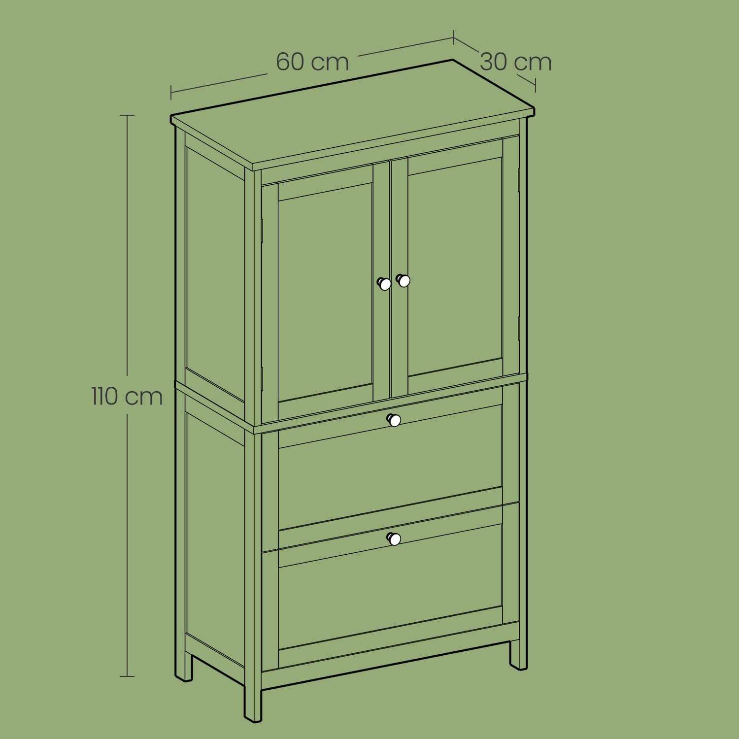 Elegantiška, talpi ir universali – ši vonios spintelė puikiai tinka tiek daiktams tvarkingai susidėti, tiek suteikti interjerui švaros ir klasikinio stiliaus akcentą. Viduje esančios lentynos yra reguliuojamo aukščio, todėl jas lengvai pritaikysite įvairaus dydžio daiktams. Du stalčiai su aukštos kokybės bėgeliais užtikrina sklandų atsidarymą, o MDF konstrukcija ir apsauga nuo apvirtimo suteikia stabilumo bei ilgaamžiškumo.