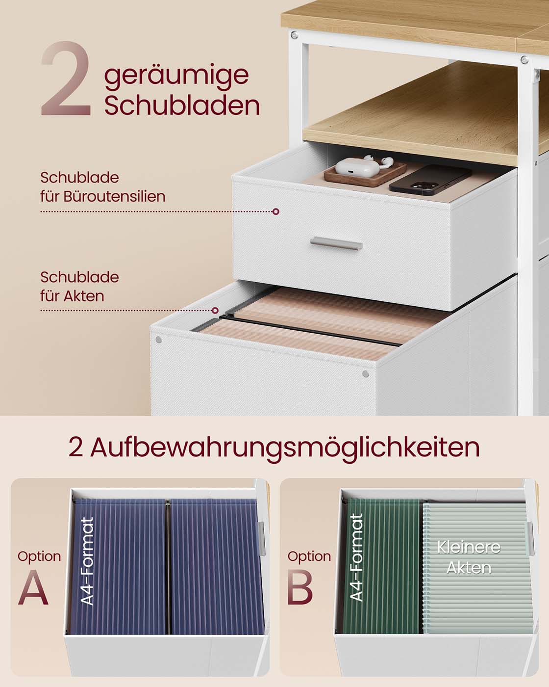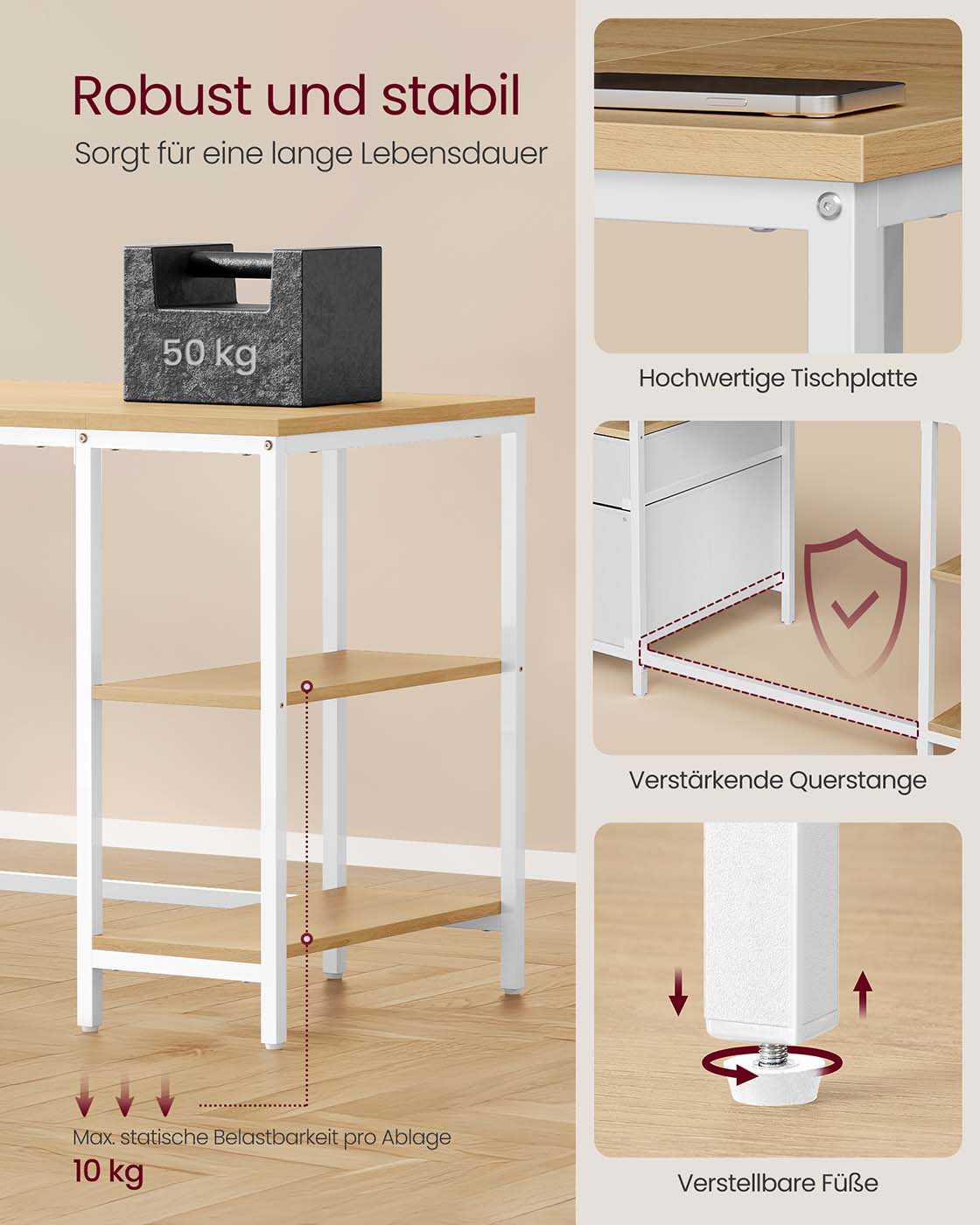 Modernus ir elegantiškas stalas su švariomis linijomis lengvai dera prie bet kurio interjero, tinka svetainei, miegamajam, darbo kambariui ar biurui. Du erdvūs stalčiai ir trys lentynos padeda palaikyti tvarką ir efektyviai organizuoti dokumentus bei biuro reikmenis. Stalčius galima montuoti kairėje arba dešinėje, o vidurinė lentyna yra nuimama, kad būtų galima pritaikyti erdvę pagal poreikius. Tvirta konstrukcija iš medžio drožlių plokštės ir plieno užtikrina ilgaamžiškumą, stalviršis atlaiko iki 50 kg, kiekviena lentyna – iki 10 kg. Surinkimas paprastas dėl aiškių, pažymėtų dalių.