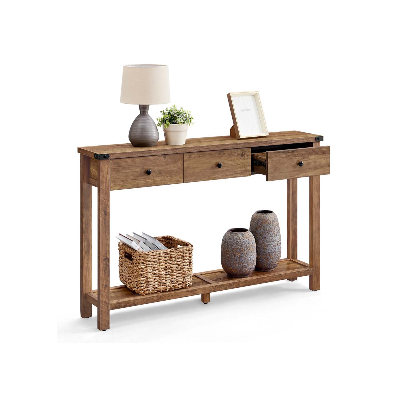Stilingas ir praktiškas staliukas su kaimiško stiliaus medžio išvaizda, metaliniais kampiniais dangteliais ir švariomis linijomis. Turi erdvų stalviršį daiktams ar dekoracijoms, tris stalčius smulkmenoms ir atvirą lentyną apačioje. Tvirtos medžiagos ir stabilios kojos užtikrina ilgaamžiškumą. Puikiai tinka prieškambariui, miegamajam ar svetainei.
