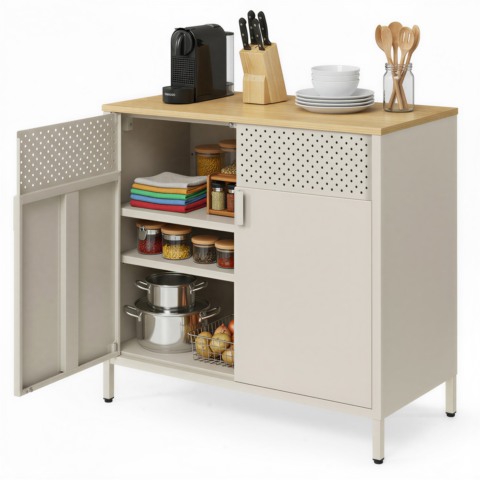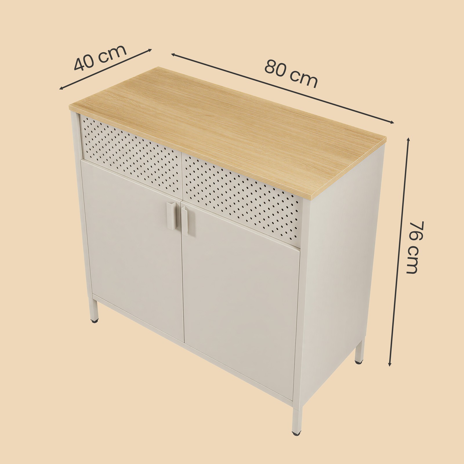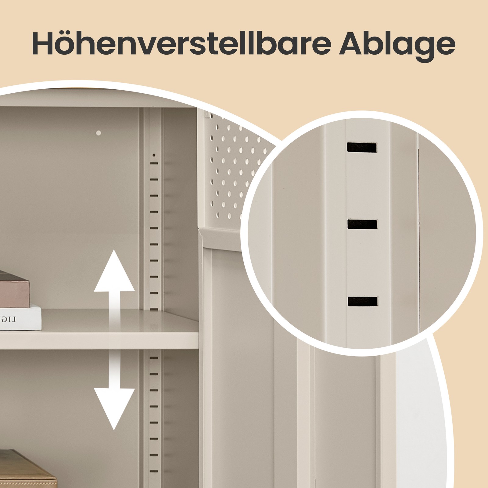 Kompaktiška ir talpi metalinė spintelė su dvigubomis durelėmis suteikia daug vietos įvairiems daiktams. Reguliuojamos lentynos leidžia lengvai pritaikyti vidinę erdvę pagal poreikius. Plieninis paviršius lengvai valomas ir išlaiko tvarkingą išvaizdą ilgą laiką. Smėlio spalvos dizainas tinka virtuvei, svetainei ar darbo kambariui, naudojant kaip indaują, TV staliuką ar universalią laikymo spintelę. Ventiliacijos angos padeda užtikrinti oro cirkuliaciją ir gali būti naudojamos priedams pakabinti. Surinkimas paprastas dėl aiškių instrukcijų.