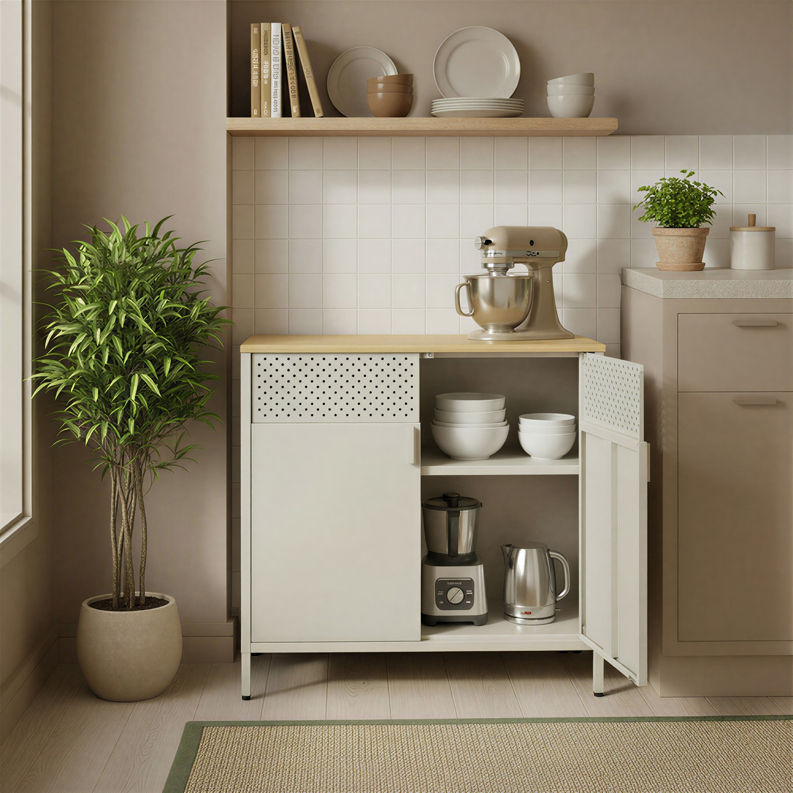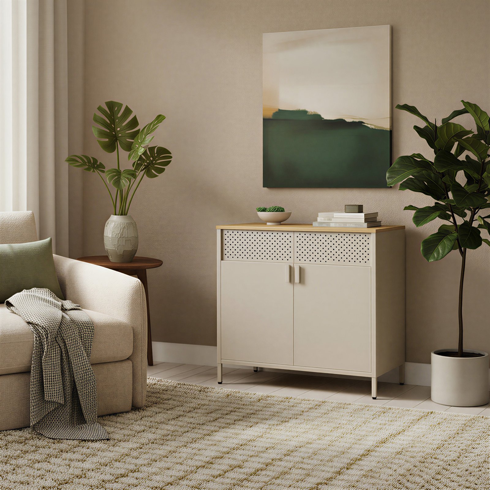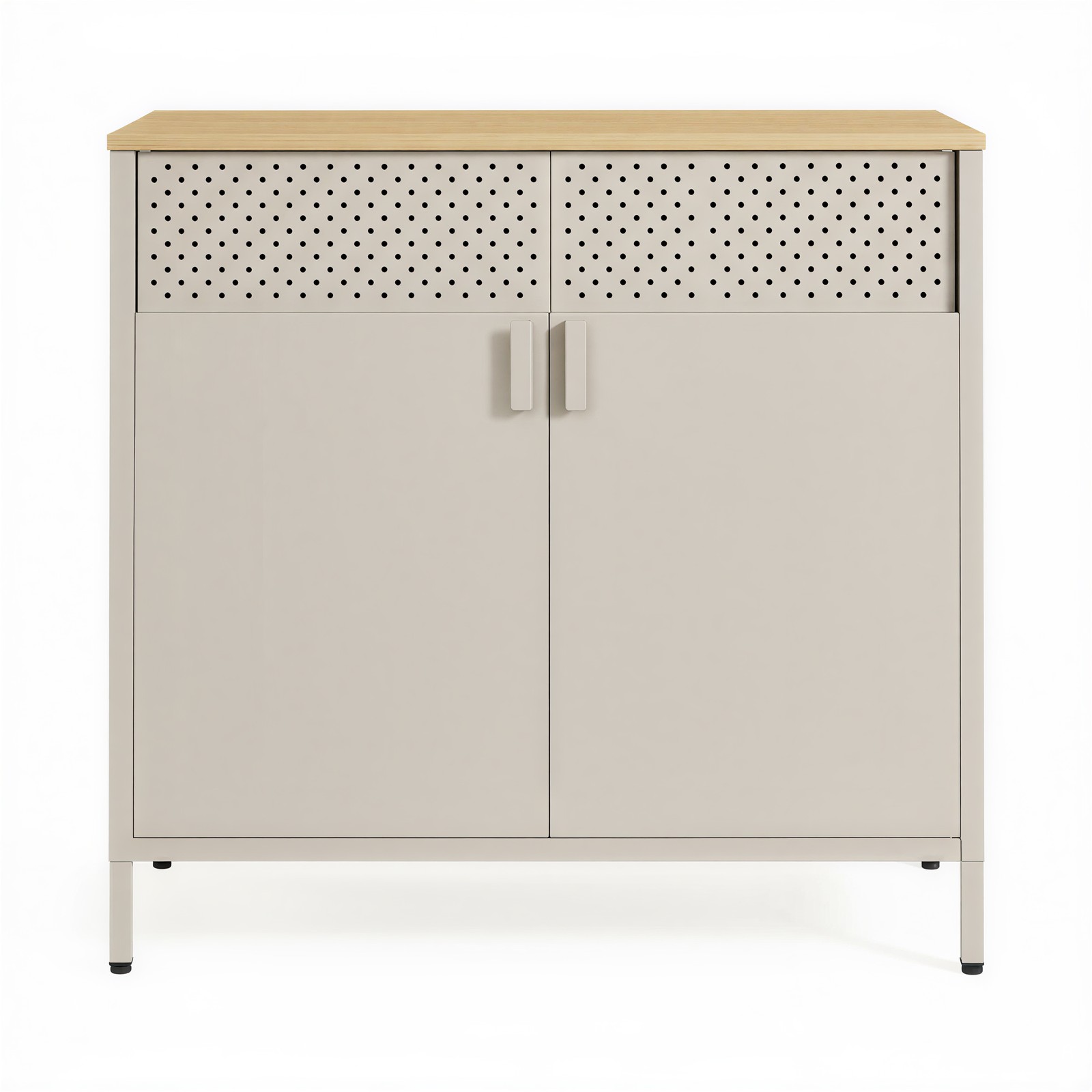 Kompaktiška ir talpi metalinė spintelė su dvigubomis durelėmis suteikia daug vietos įvairiems daiktams. Reguliuojamos lentynos leidžia lengvai pritaikyti vidinę erdvę pagal poreikius. Plieninis paviršius lengvai valomas ir išlaiko tvarkingą išvaizdą ilgą laiką. Smėlio spalvos dizainas tinka virtuvei, svetainei ar darbo kambariui, naudojant kaip indaują, TV staliuką ar universalią laikymo spintelę. Ventiliacijos angos padeda užtikrinti oro cirkuliaciją ir gali būti naudojamos priedams pakabinti. Surinkimas paprastas dėl aiškių instrukcijų.