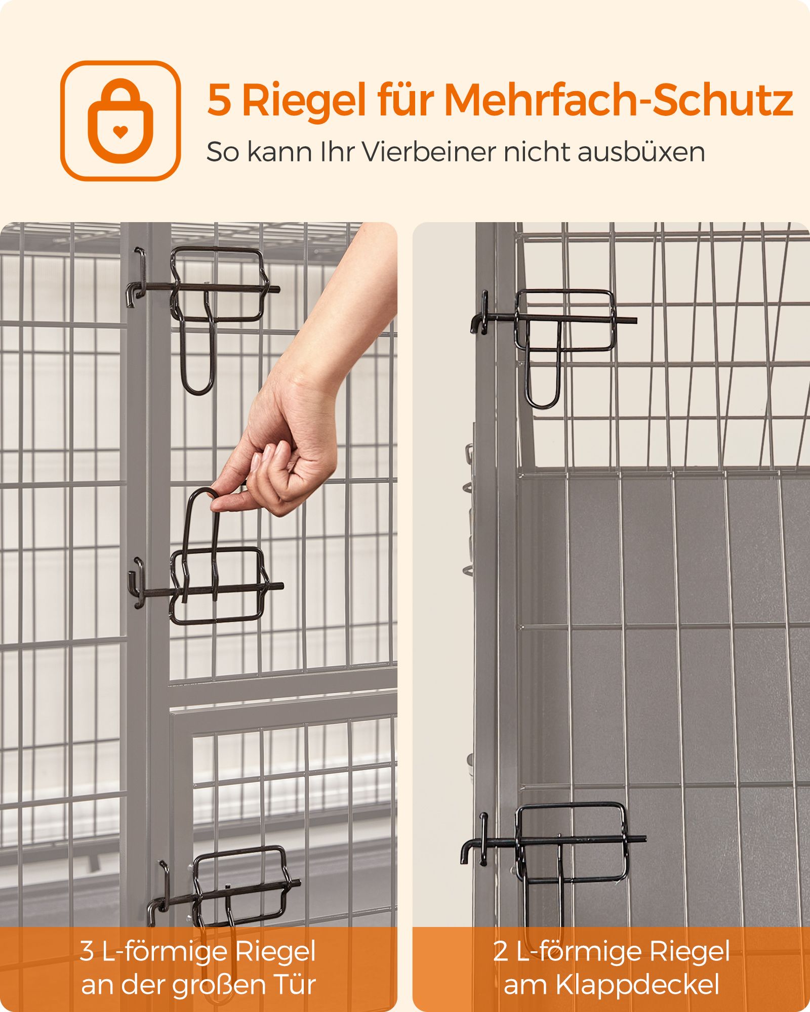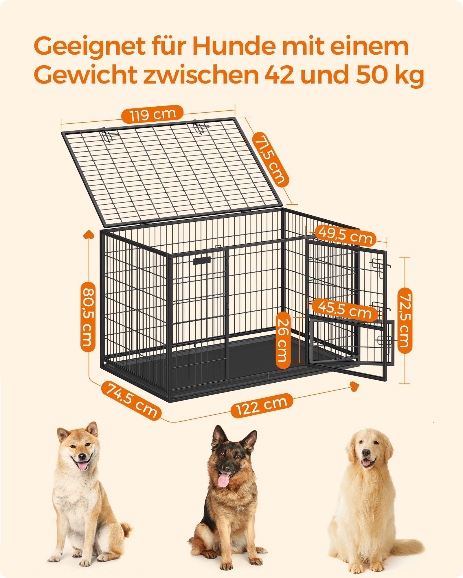 Tvirtas ir saugus narvas, pagamintas iš aukštos kokybės metalo, užtikrina patikimą prieglobstį jūsų augintiniui. Penki L formos skląsčiai saugiai uždaro duris, o rūdims atspari konstrukcija garantuoja ilgaamžiškumą. Lygi metalo danga yra saugi ir komfortiška šunims.