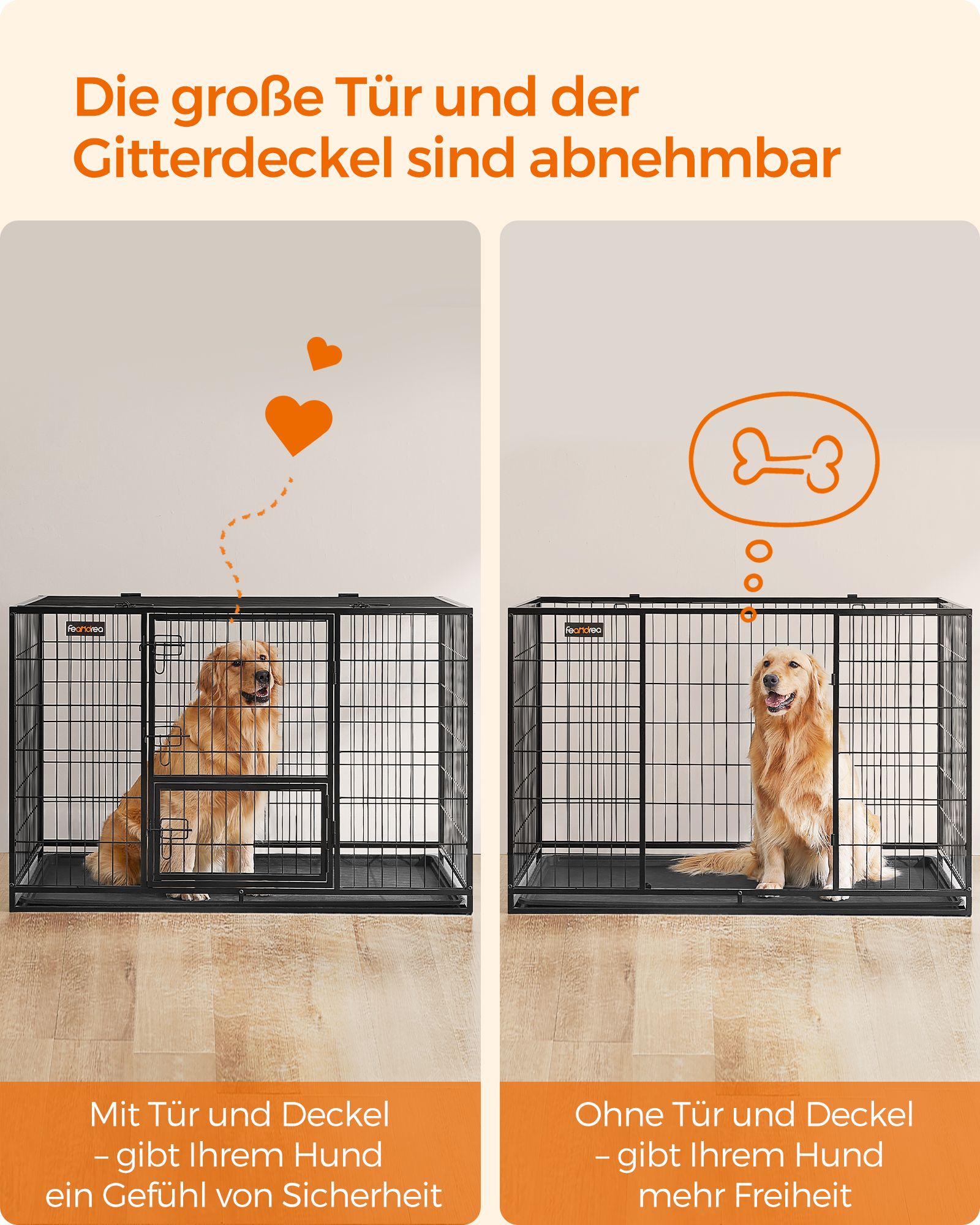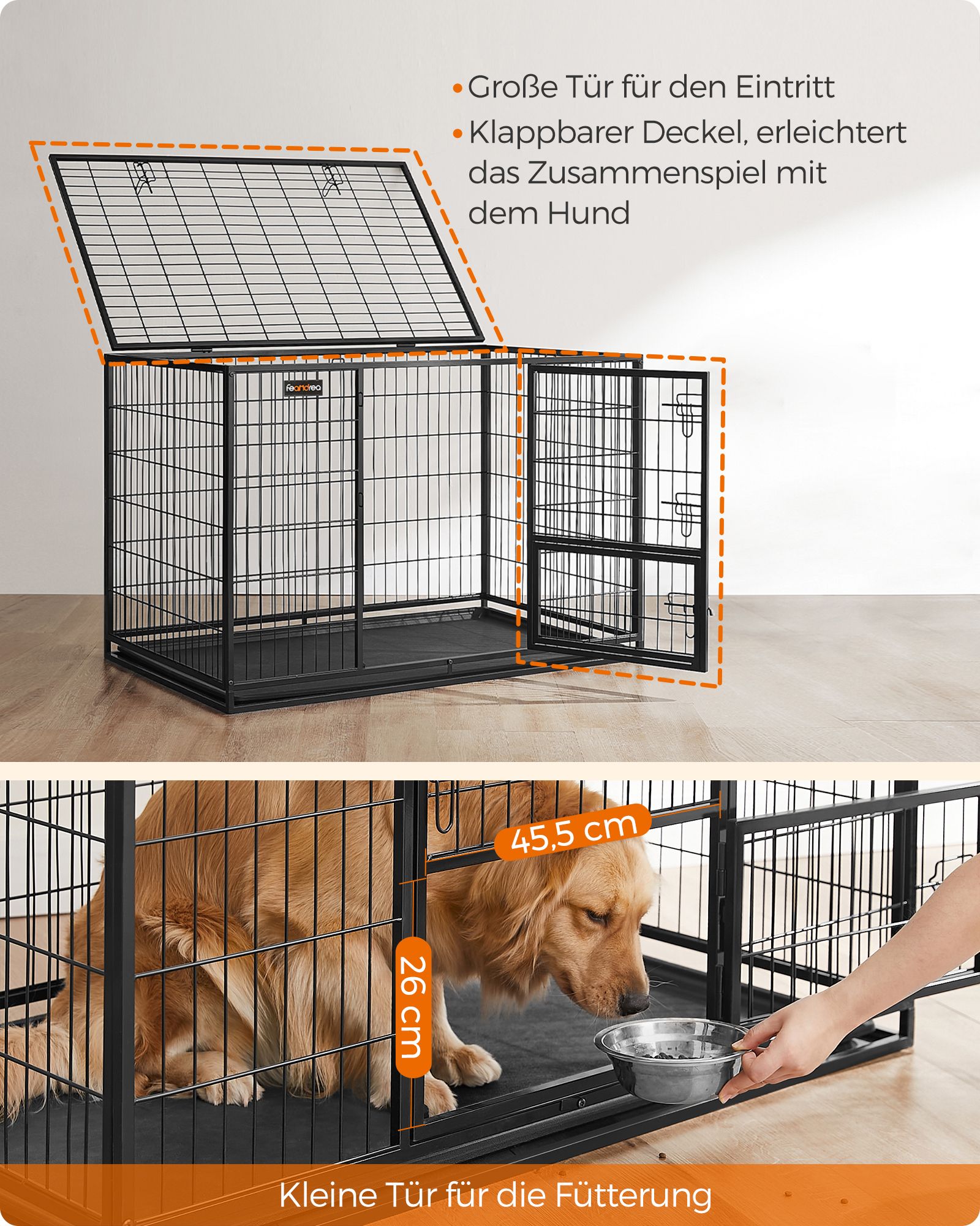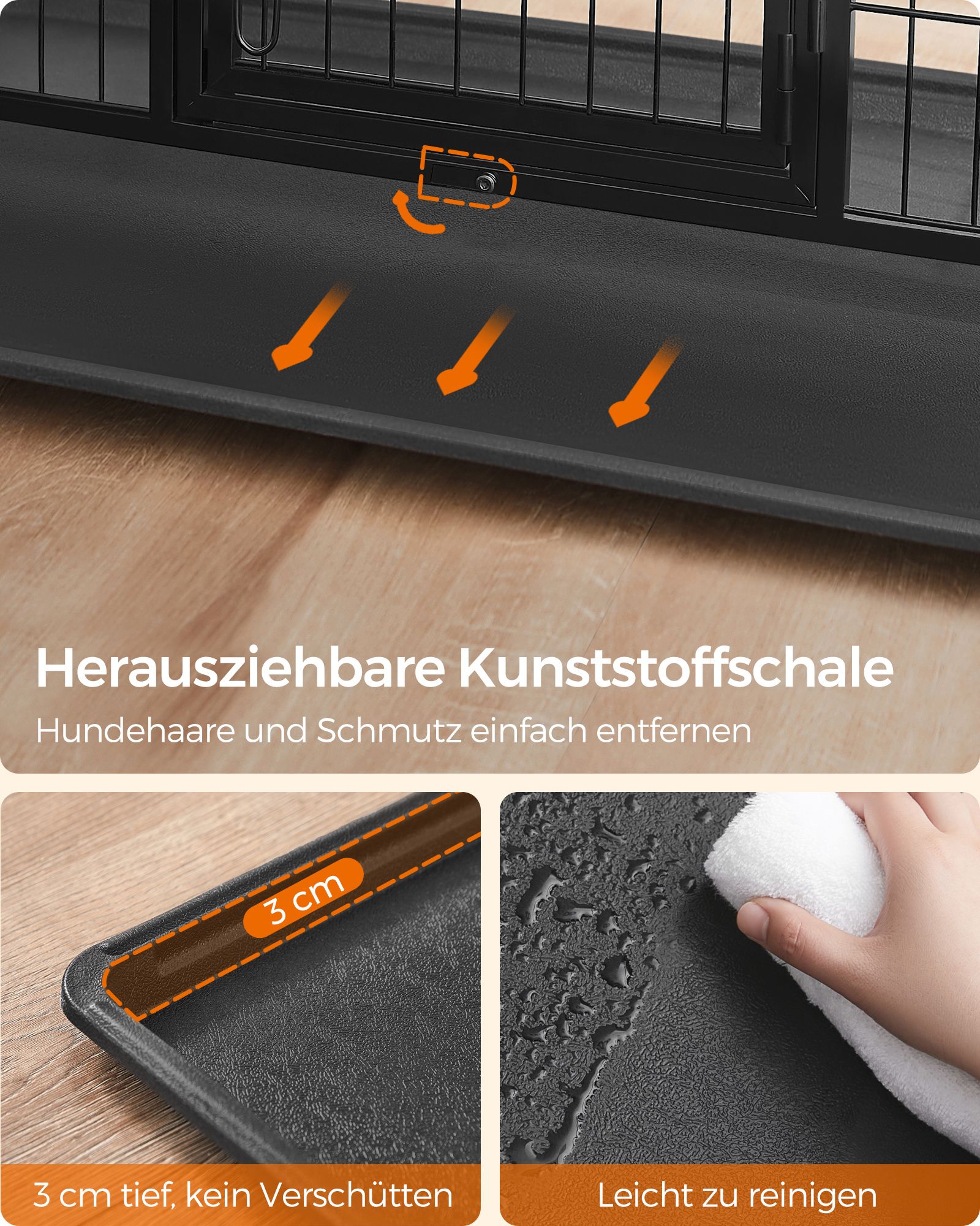 Nuimamos durelės ir viršutinė plokštė leidžia narvą pritaikyti pagal poreikius – paverskite jį bėgimo taku ar žaidimų zona. Lengvai išimamas dugno padėklas padeda palaikyti švarą be didelių pastangų.