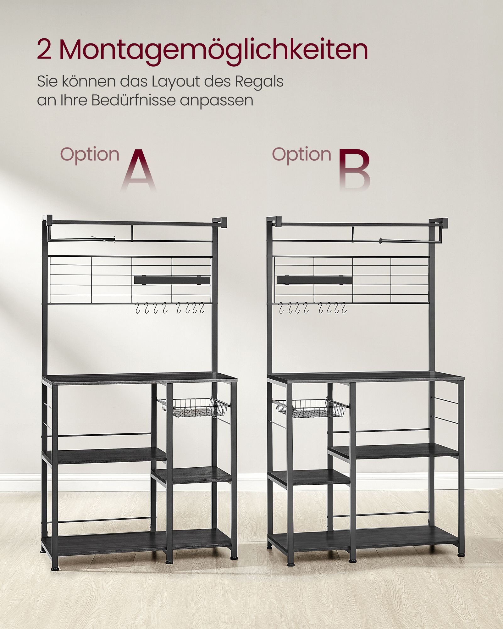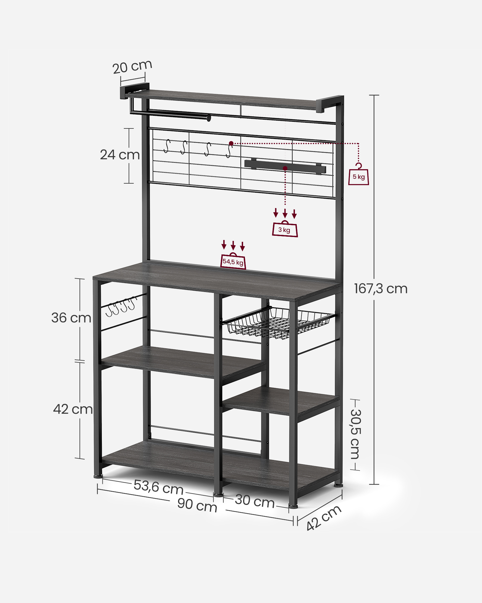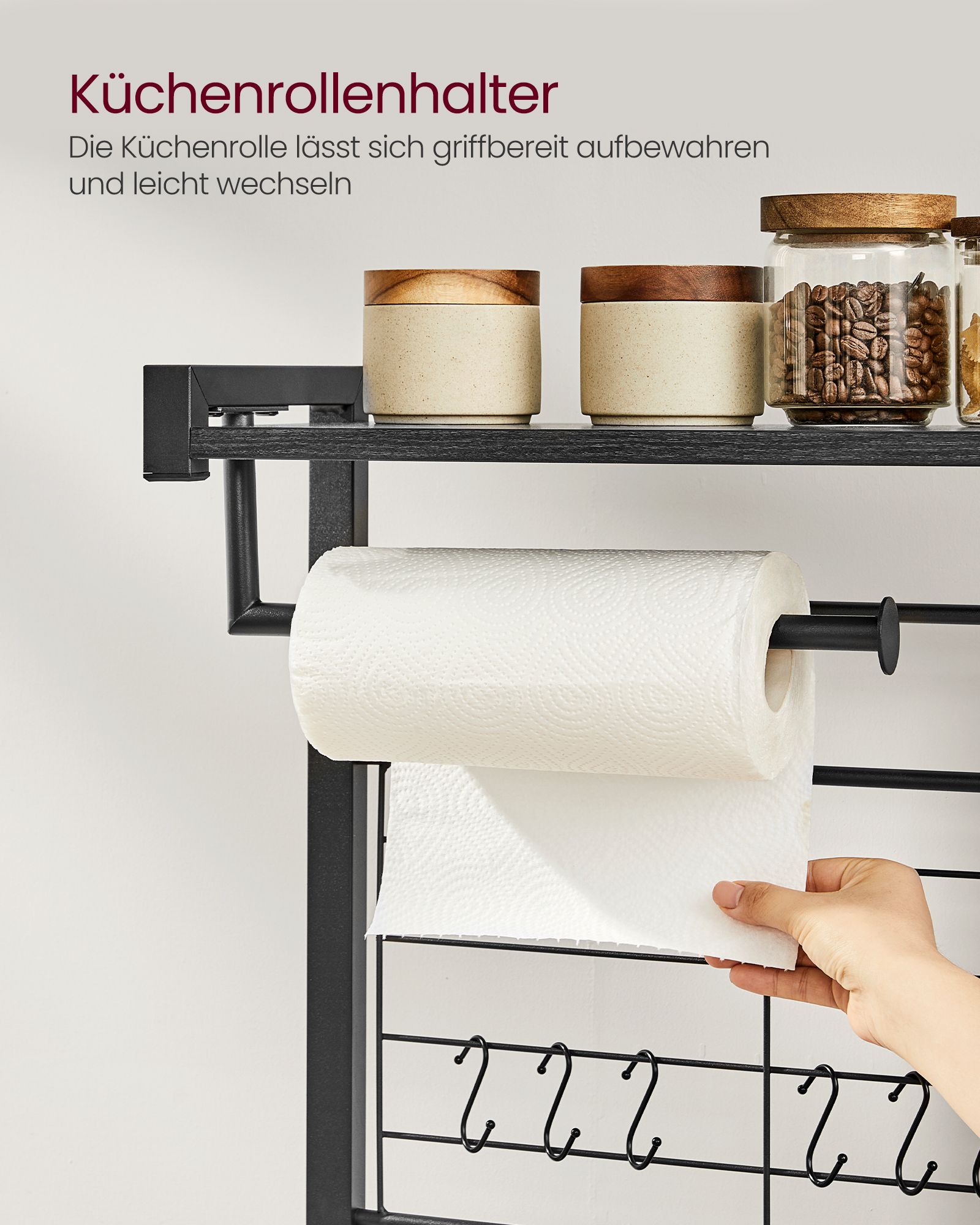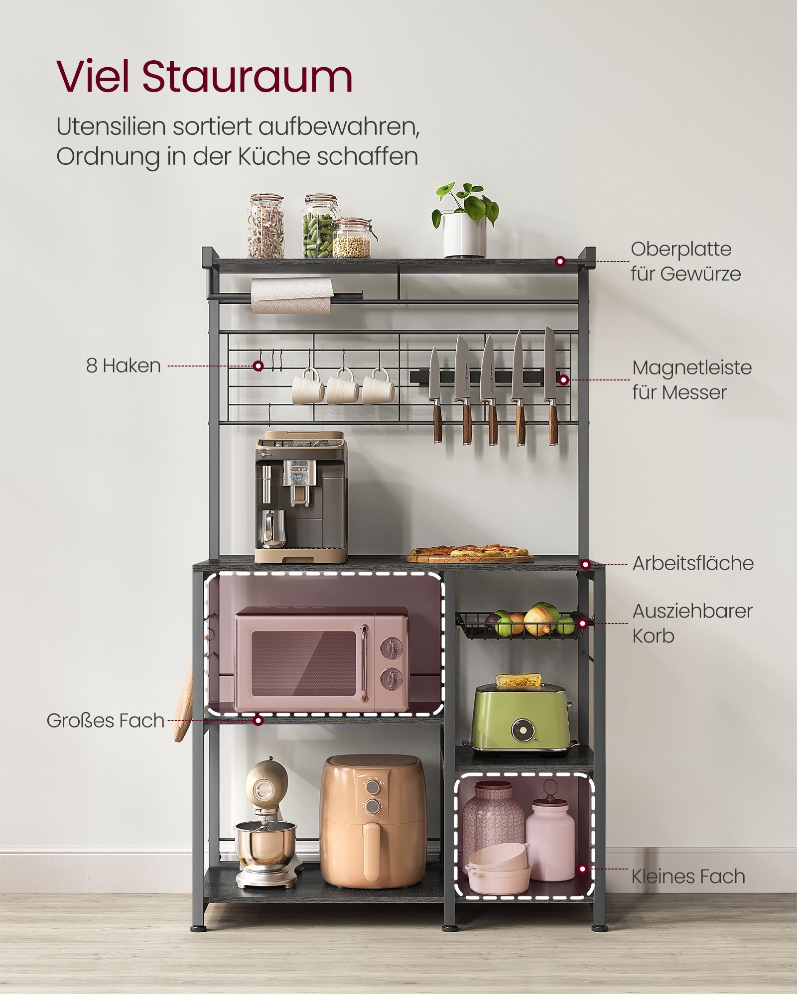 Ši daugiafunkcė virtuvės lentyna suteikia itin daug vietos ir leidžia patogiai susidėti visus dažnai naudojamus virtuvės reikmenis. Ji turi viršutinę lentyną prieskoniams, 12 kabliukų puodams ir įrankiams, kelias talpias lentynas buitiniai technikai, tokiai kaip mikrobangų krosnelė, skrudintuvas ar kavos aparatas.