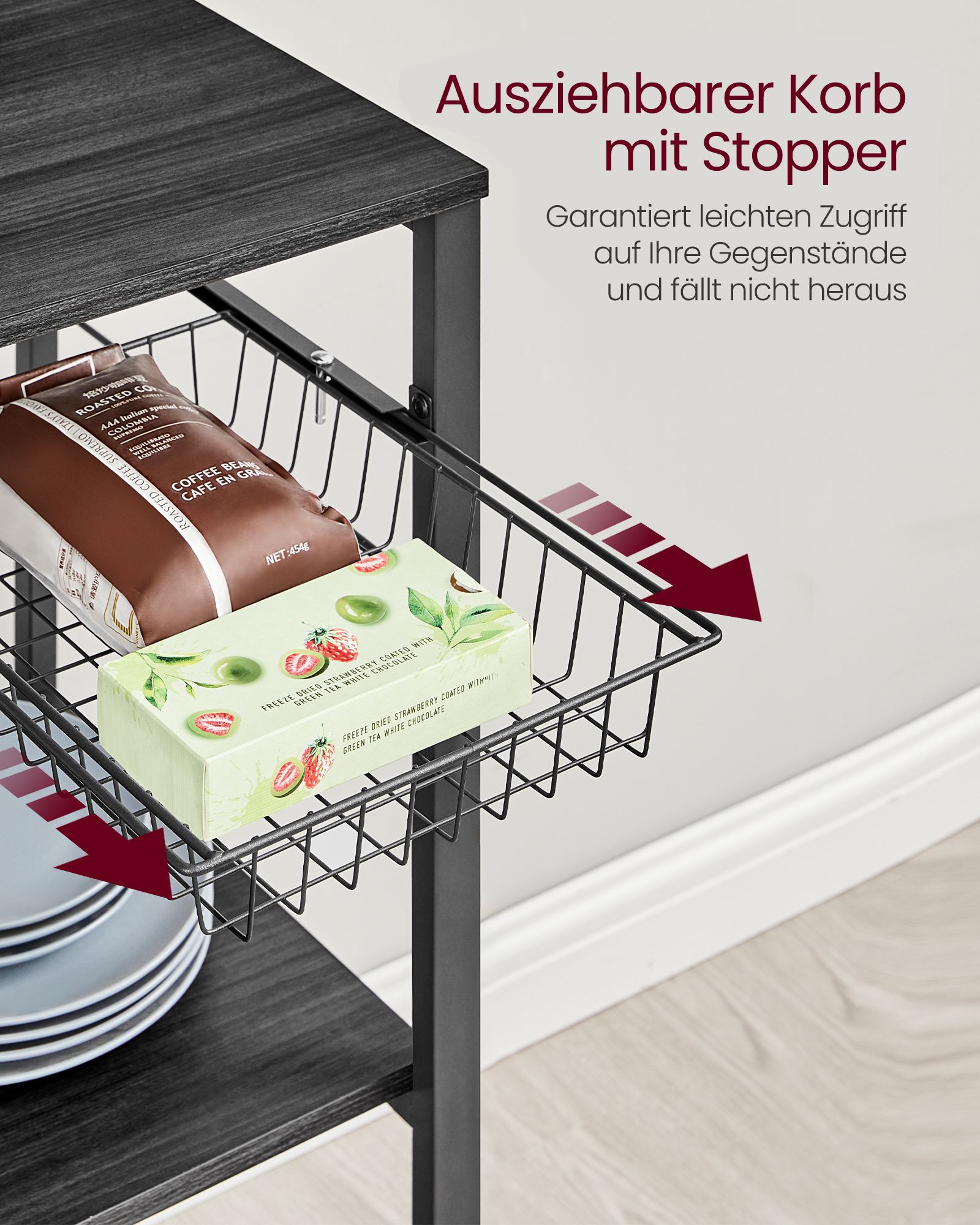 Magnetinė juostelė (3 kg laikymo jėga) leidžia saugiai pakabinti peilius, o virtuvinių rankšluosčių laikiklis užtikrina, kad servetėlės būtų visada po ranka. Ištraukiamas vielinis krepšelis patogiai talpina smulkius virtuvės daiktus – jis turi kamštį, kuris apsaugo nuo iškritimo.