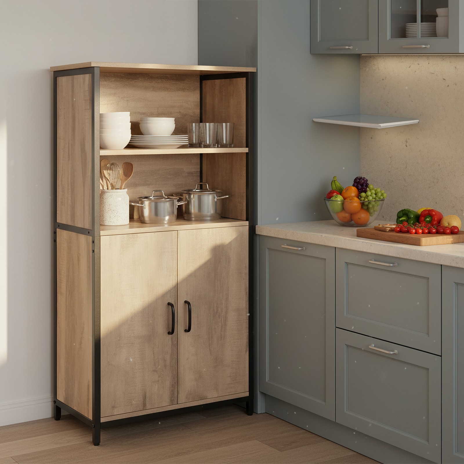 Funkcionali ir stilinga spintelė, suteikianti daug vietos daiktams laikyti. Atviri skyriai puikiai tinka knygoms, augalams ar biuro reikmenims, o už durelių esanti reguliuojama lentyna leidžia patogiai laikyti įvairaus dydžio daiktus. Tvirtas plieninis rėmas ir reguliuojamos kojelės užtikrina stabilumą net ant nelygių grindų. Dėl universalaus dizaino spintelė puikiai dera svetainėje, virtuvėje ar biure. Surinkimas paprastas ir greitas dėl aiškių instrukcijų.