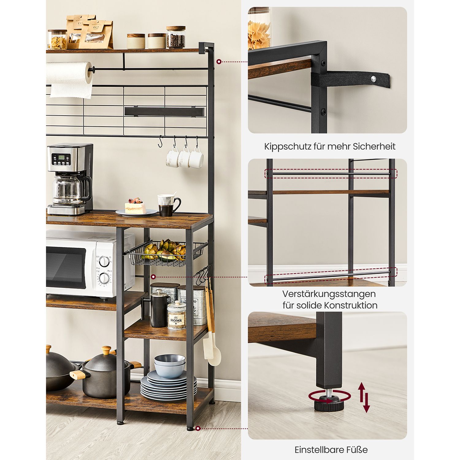 Funkcionali ir tvirta virtuvės lentyna, skirta maksimaliai išnaudoti jūsų virtuvės erdvę. Viršutinė lentyna puikiai tinka prieskoniams, o darbo paviršius atlaiko net mikrobangų krosnelę ar kavos aparatą. 12 kabliukų leidžia pakabinti keptuves, menteles ar kitus įrankius, o ištraukiamas vielinis krepšys ir papildomos lentynos suteikia vietos smulkiems daiktams.