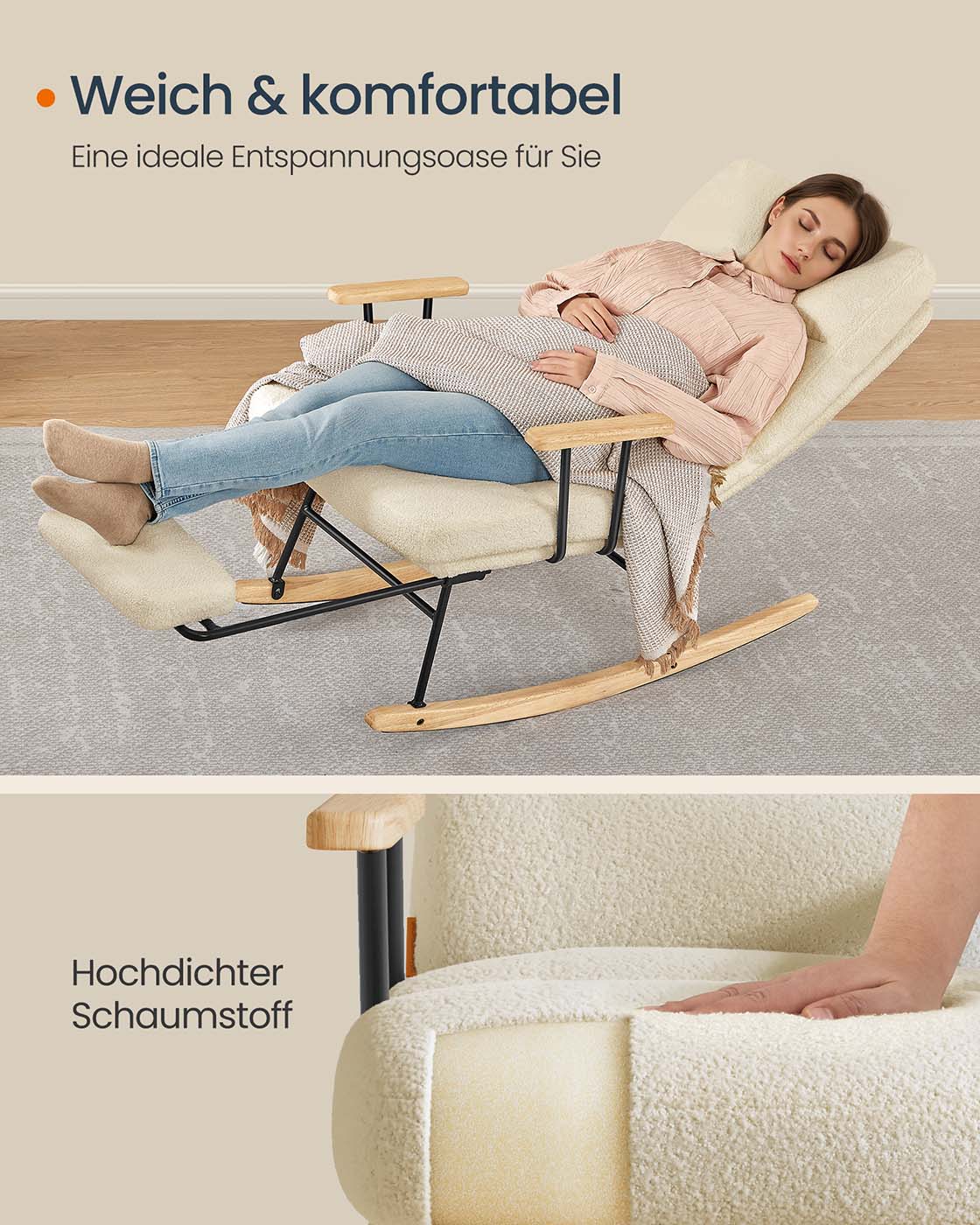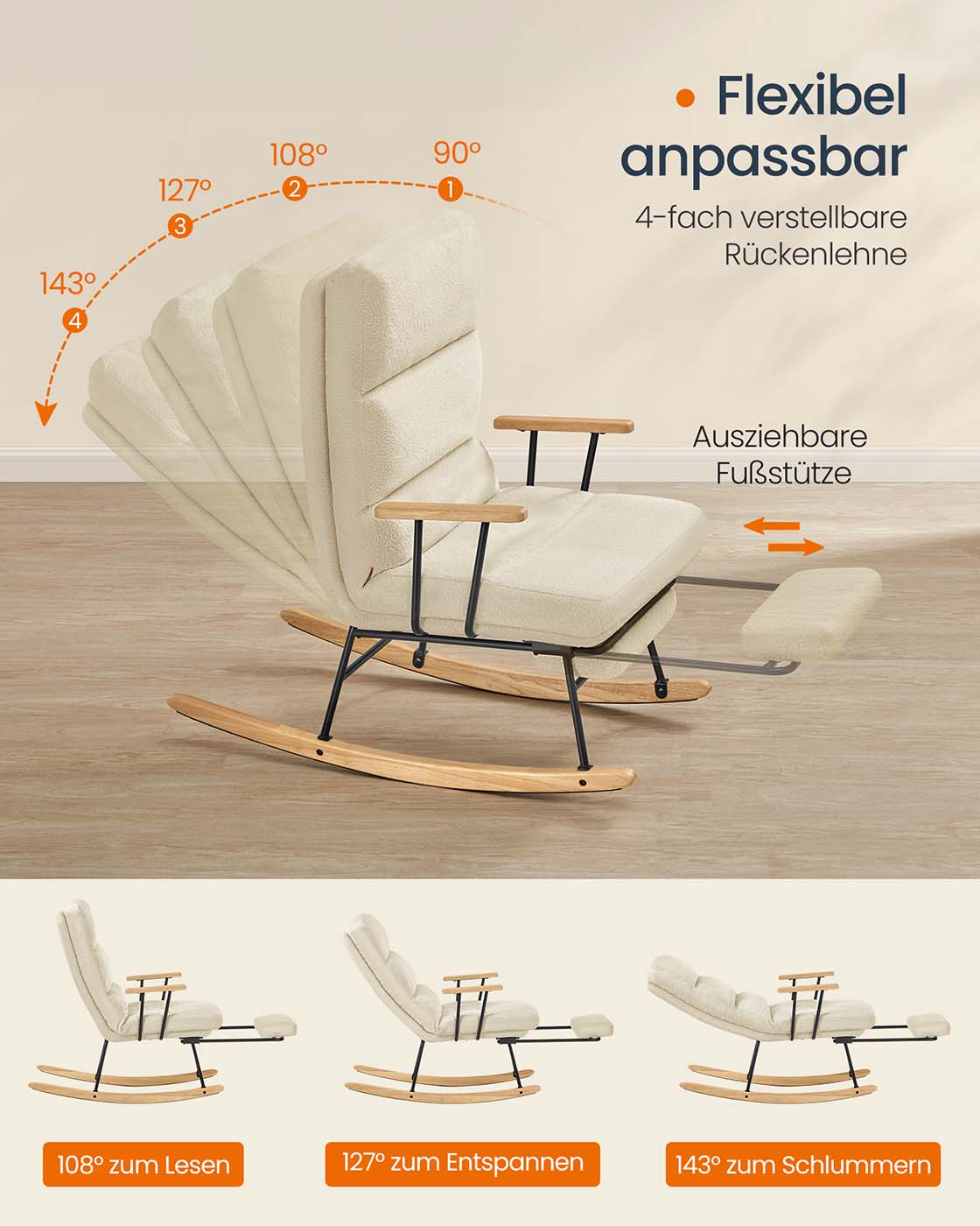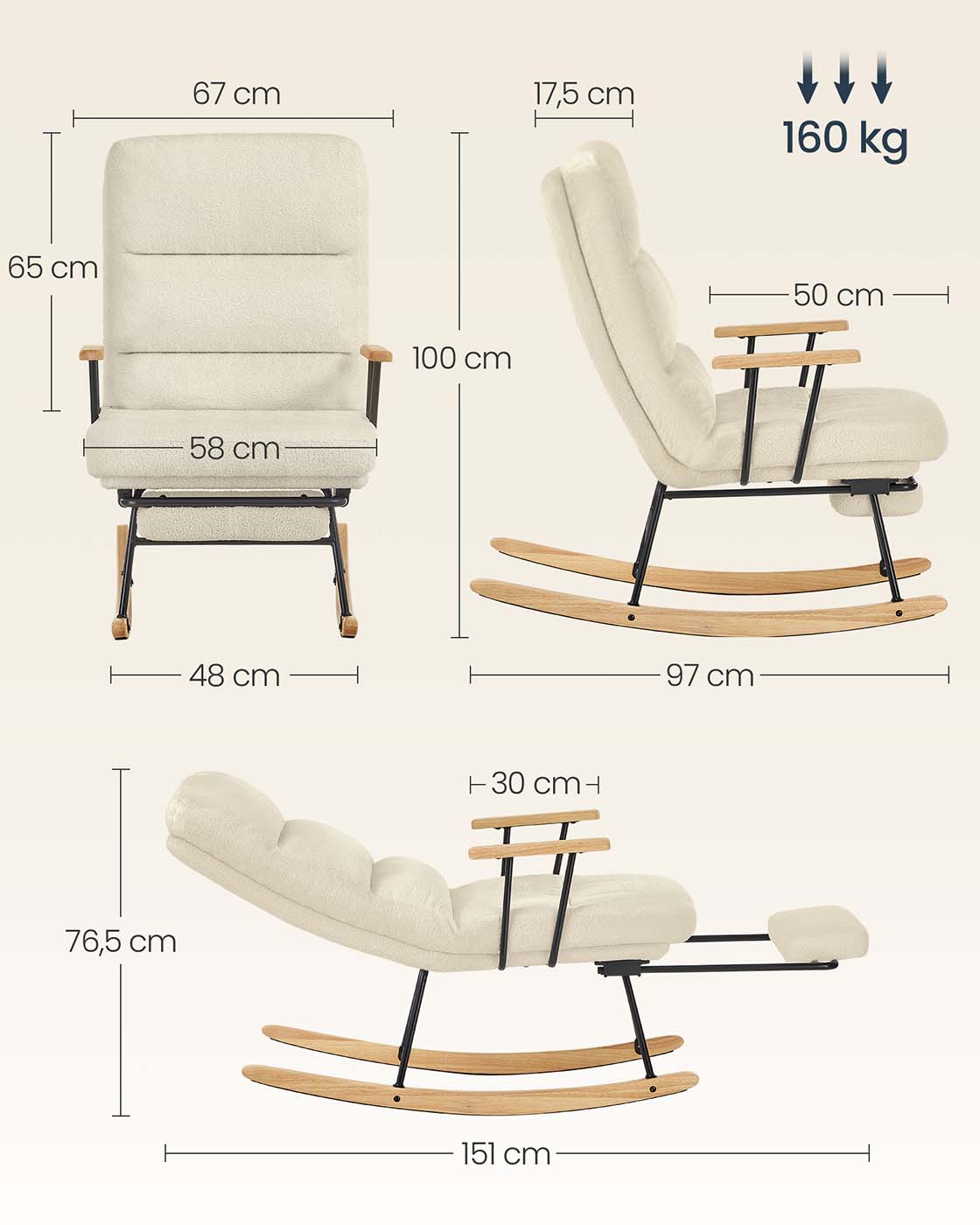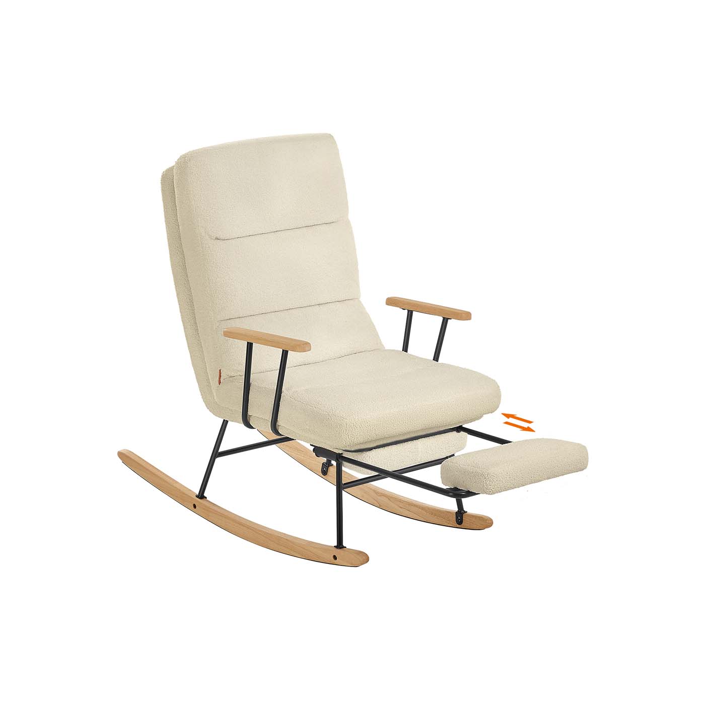 Patogi supamoji kėdė su keturiomis reguliuojamo atlošo padėtimis leidžia lengvai rasti tinkamiausią poziciją poilsiui ar skaitymui. Ištraukiama pakoja suteikia papildomą komfortą, leidžiant pakelti kojas ir atsipalaiduoti. Kreminės spalvos dizainas ir natūralios medienos kojelės puikiai dera bet kuriame interjere, tinka miegamajam, svetainei ar darbo kambariui. Minkšta vilna, didelio tankio putos ir maloniai paminkštintas atlošas užtikrina komfortą, o plieninis rėmas ir tvirtos medienos kojelės garantuoja stabilumą bei 160 kg keliamąją galią. Neleidžiančios slysti kojelės suteikia papildomo saugumo.