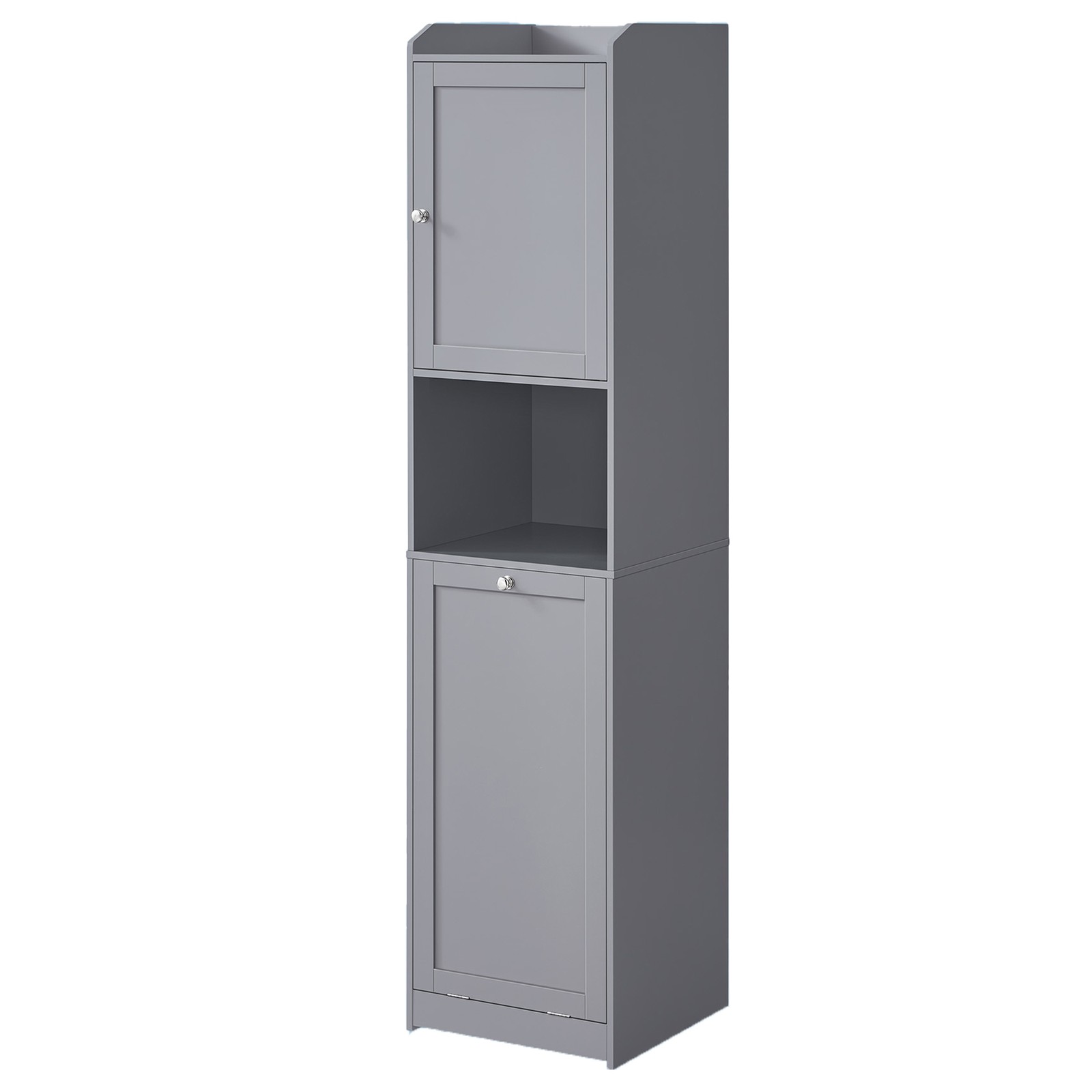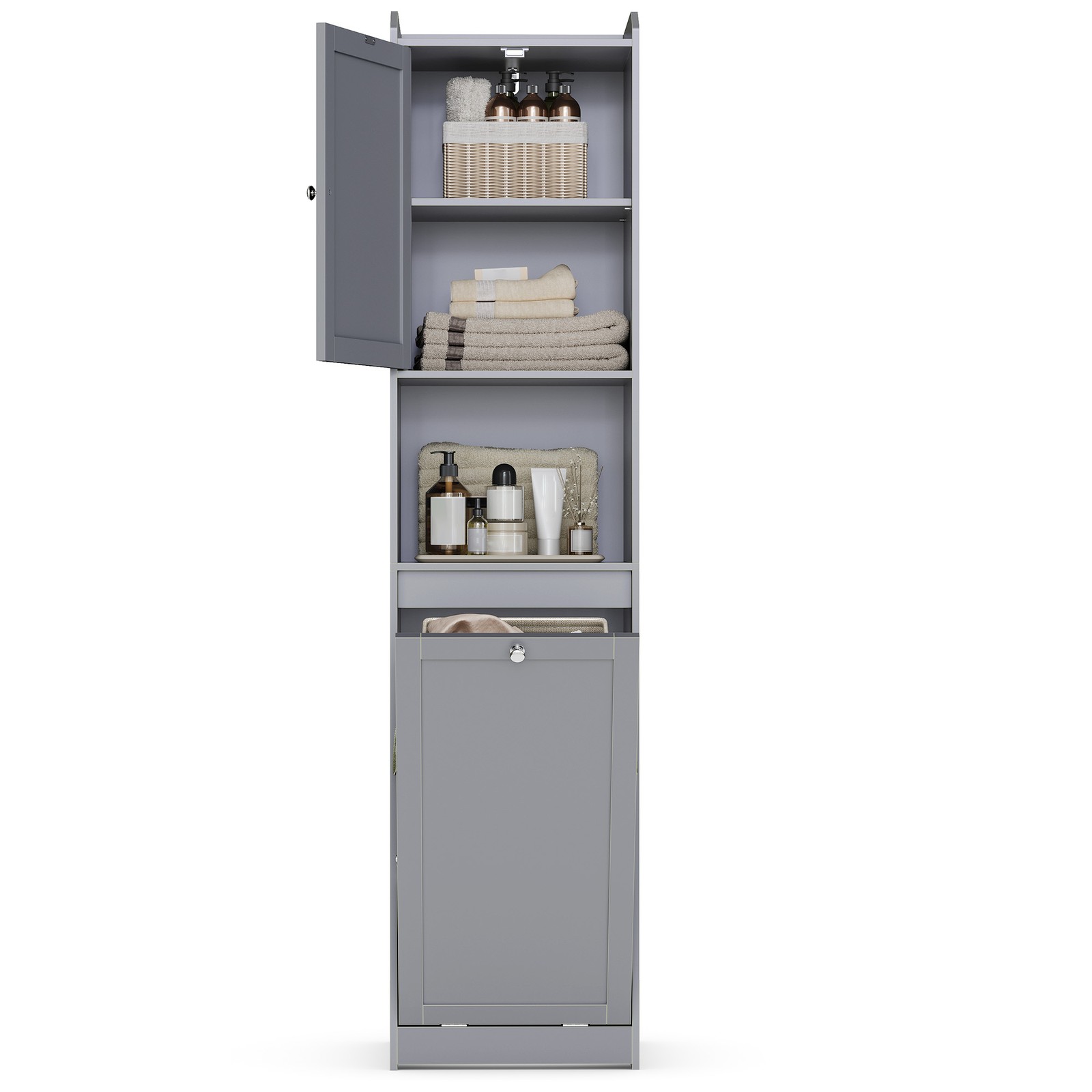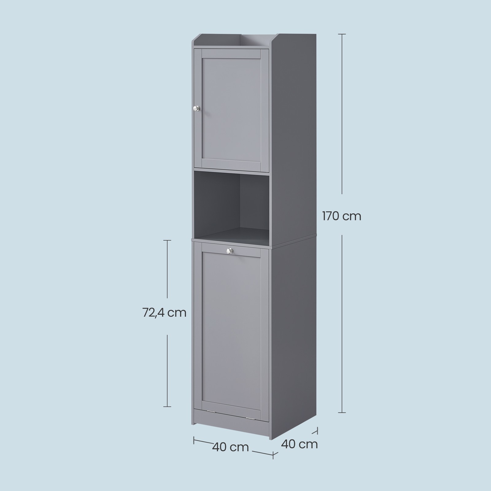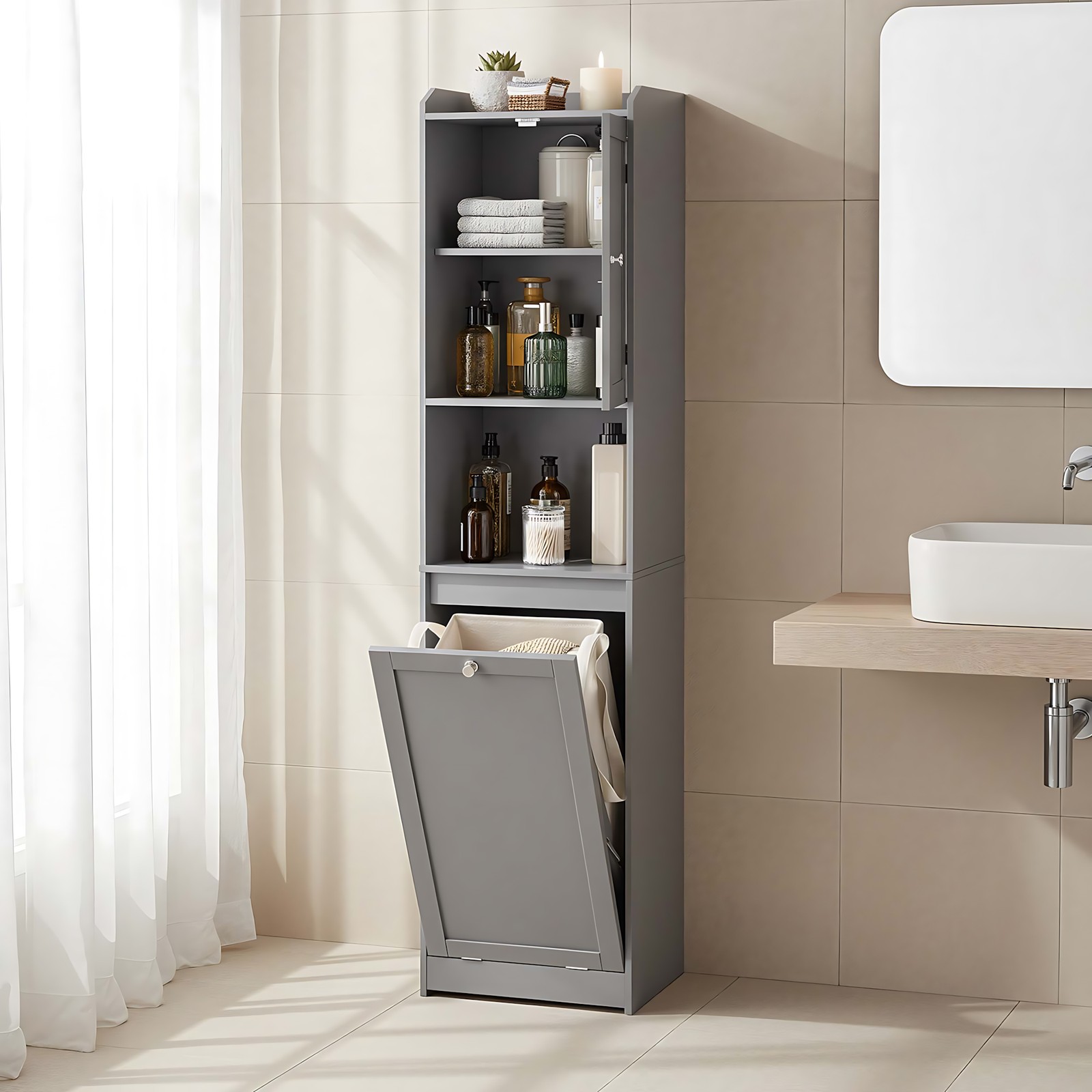 Siaura vonios spintelė su išimamu skalbinių krepšiu, pilkos spalvos