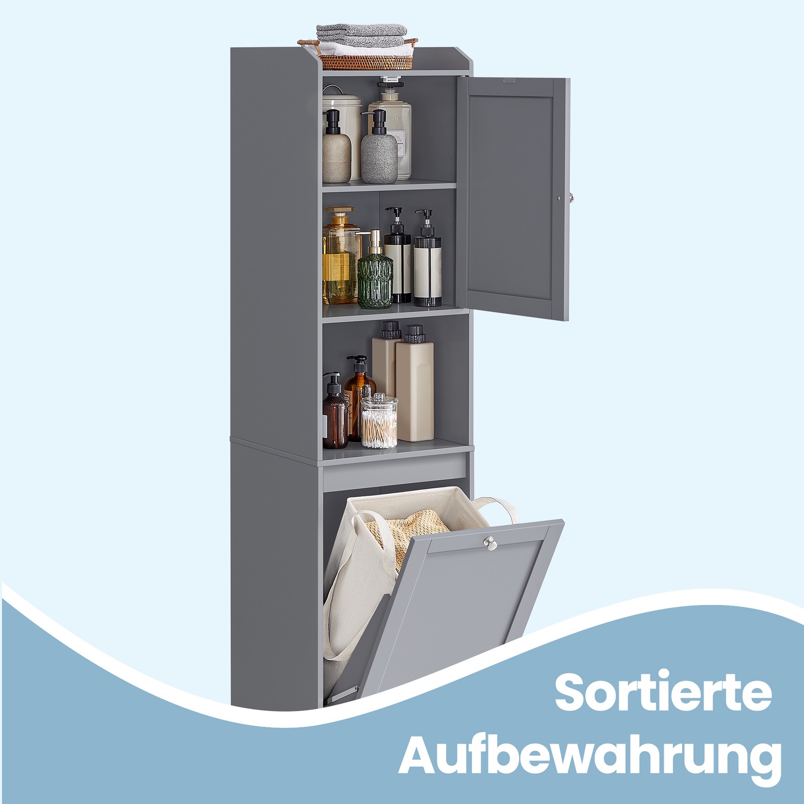 Funkcionali ir vietą tausojanti vonios spintelė, sukurta patogiam daiktų laikymui ir skalbinių rūšiavimui. Keli uždari skyriai padeda palaikyti tvarką ir paslėpti asmeninius daiktus, o išimamas skalbinių krepšys su rankenomis leidžia lengvai pernešti skalbinius tiesiai į skalbimo mašiną. Vandeniui atsparus krepšys ir lengvai valomas paviršius užtikrina paprastą priežiūrą. Tvirta konstrukcija, apsauga nuo apvirtimo ir reguliuojamos lentynos suteikia tiek saugumo, tiek lankstumo kasdieniam naudojimui. Idealiai tinka mažoms ir vidutinėms vonios erdvėms.