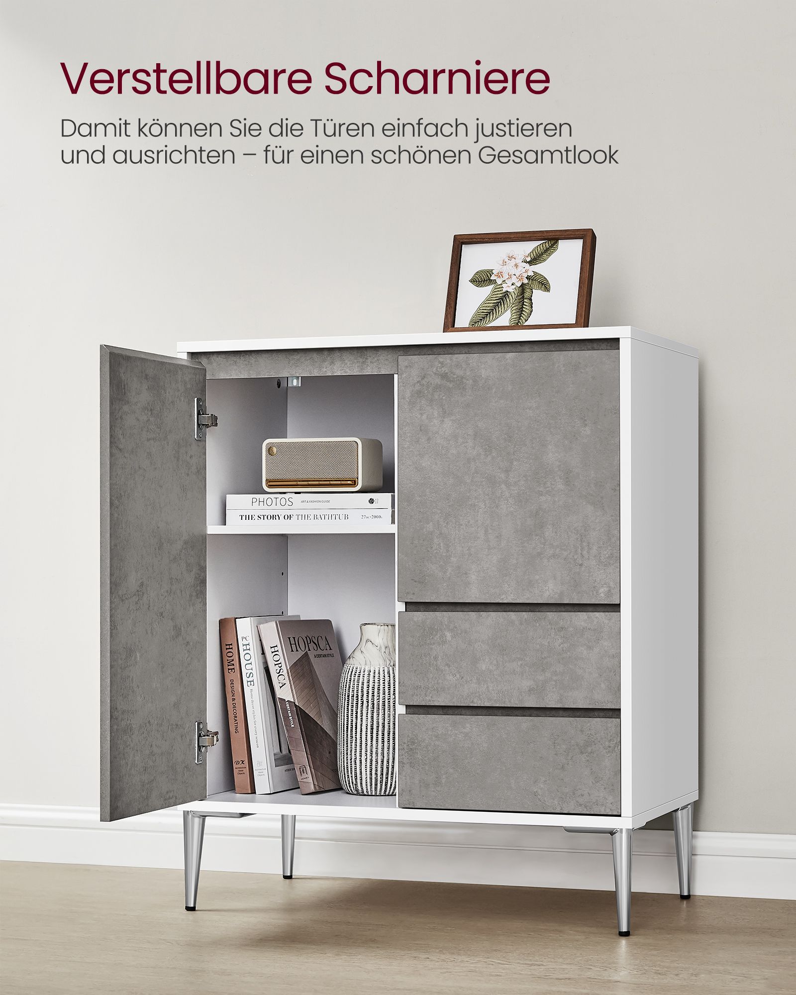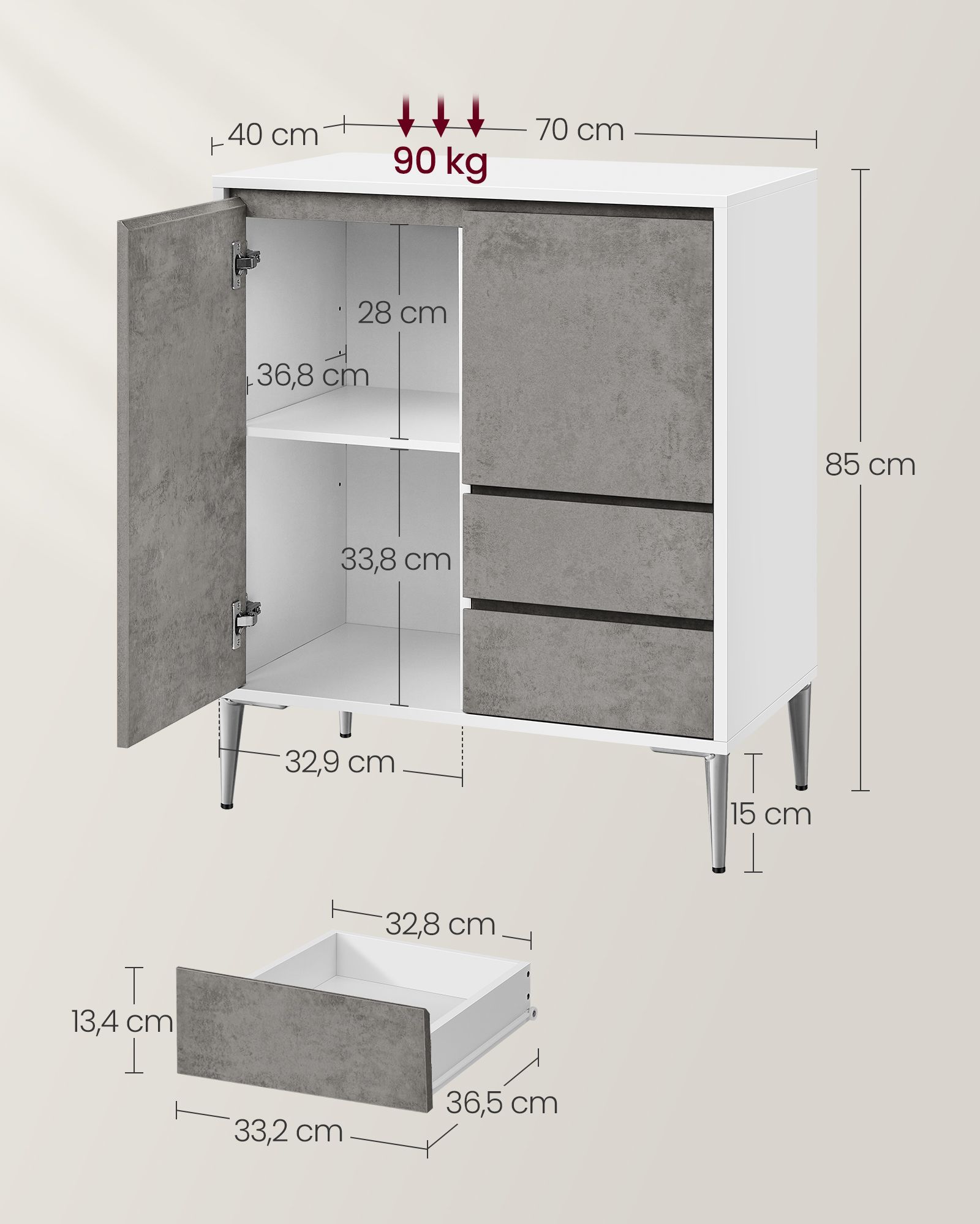 Stilinga ir funkcionali spintelė kasdieniam naudojimui įvairiose namų erdvėse. Už dviejų durelių esanti reguliuojamo aukščio lentyna leidžia laikyti įvairaus dydžio daiktus, o du stalčiai ir platus viršutinis paviršius suteikia papildomos vietos smulkmenoms. Aukštos kojelės užtikrina lengvą grindų priežiūrą – robotas siurblys lengvai pravažiuos. Nuožulnūs kraštai ir reguliuojami vyriai suteikia patogų naudojimą, o minimalistinis dizainas stilingai įsilieja į svetainę, prieškambarį, valgomojo ar darbo zoną. Su apsauga nuo apvirtimo – saugiam naudojimui.