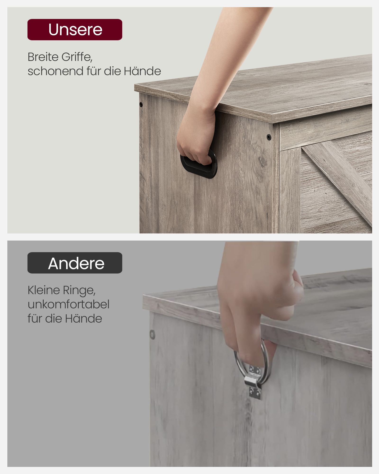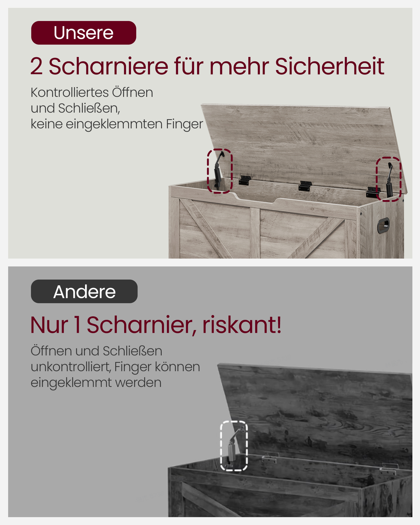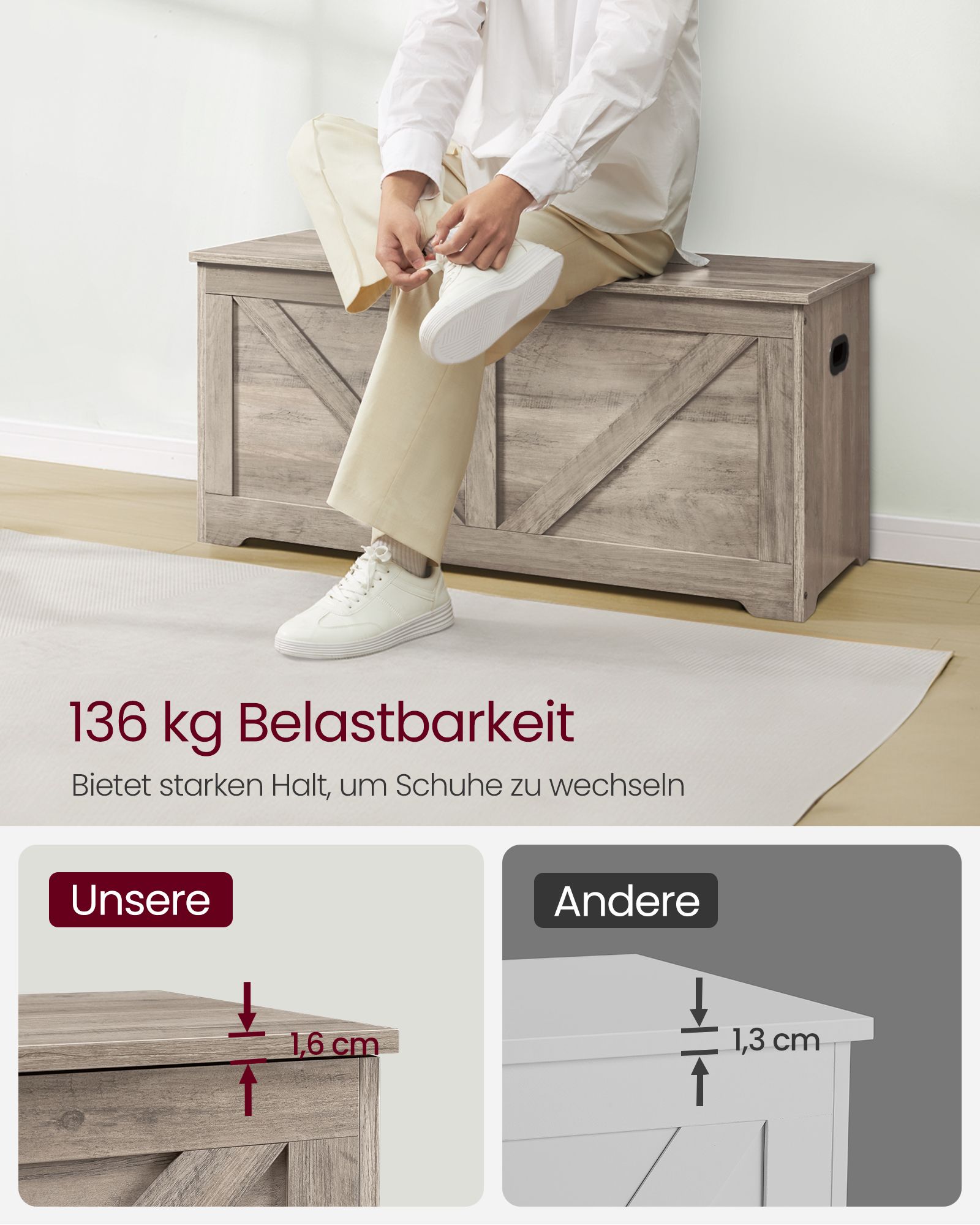 Talpus ir stilingas kaimiško stiliaus suolas su daiktadėže suteikia daug vietos tvarkingai laikyti antklodes, pagalves, drabužius ar knygas. Du saugos vyriai užtikrina, kad dangtis išliktų atviras bet kokiu kampu ir užsidarytų švelniai, apsaugodamas nuo pirštų suspaudimo. Tvirta konstrukcija leidžia paviršiui atlaikyti iki 136 kg, o vidinei daiktadėžei – iki 60 kg, tad ant suoliuko galima patogiai atsisėsti ir persiauti batus. Patogios šoninės rankenos leidžia lengvai perkelti suolą į bet kurią erdvę. Surinkimas paprastas, pasitelkiant aiškias instrukcijas ir pažymėtas dalis.