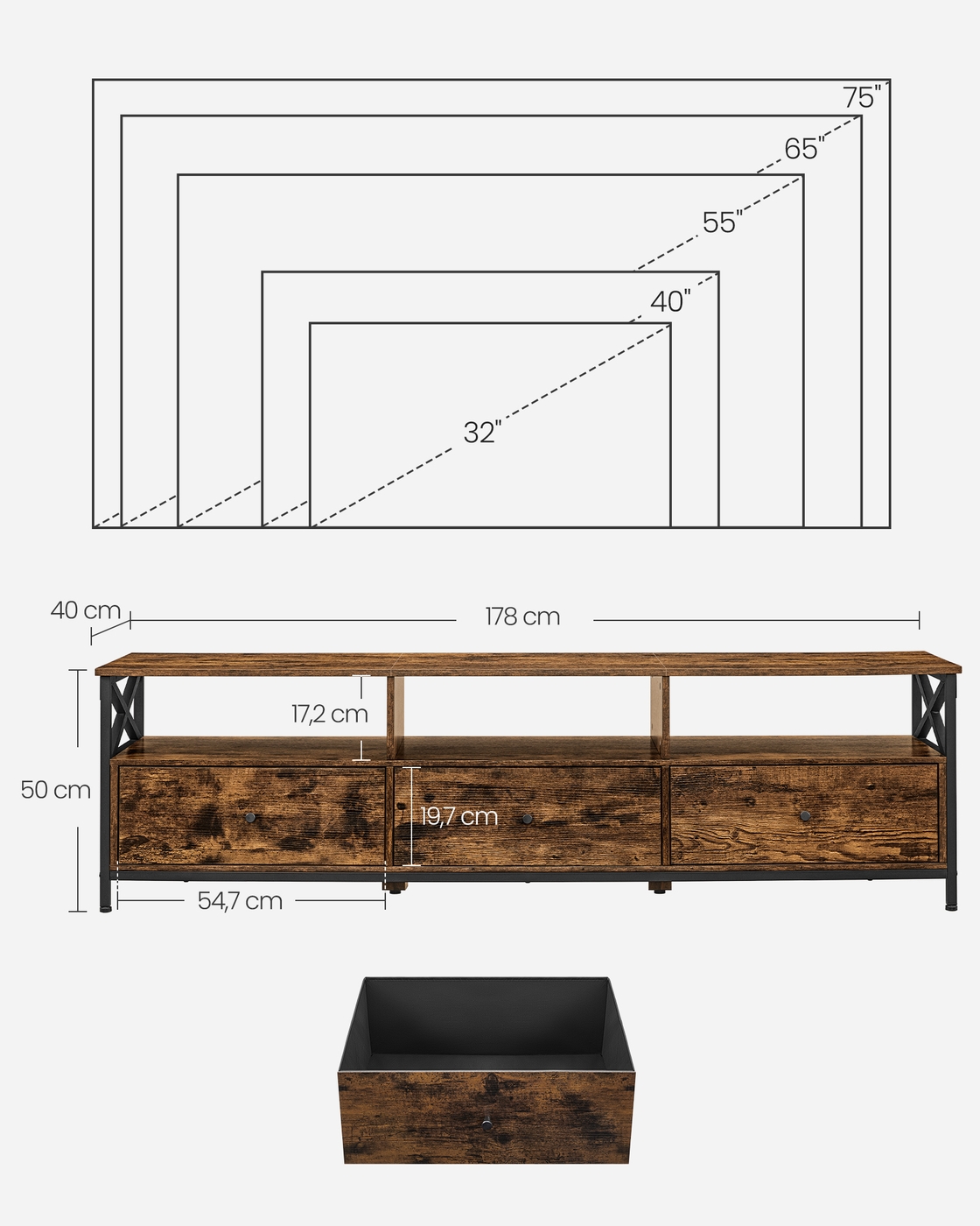 Talpi TV spintelė, skirta televizoriams iki 80 colių ir patogiam daiktų laikymui svetainėje. Spintelė turi tris stalčius ir tris atviras lentynas, todėl lengvai susidėsite tiek elektronikos priedus, tiek dekoracijas ar kitus daiktus.