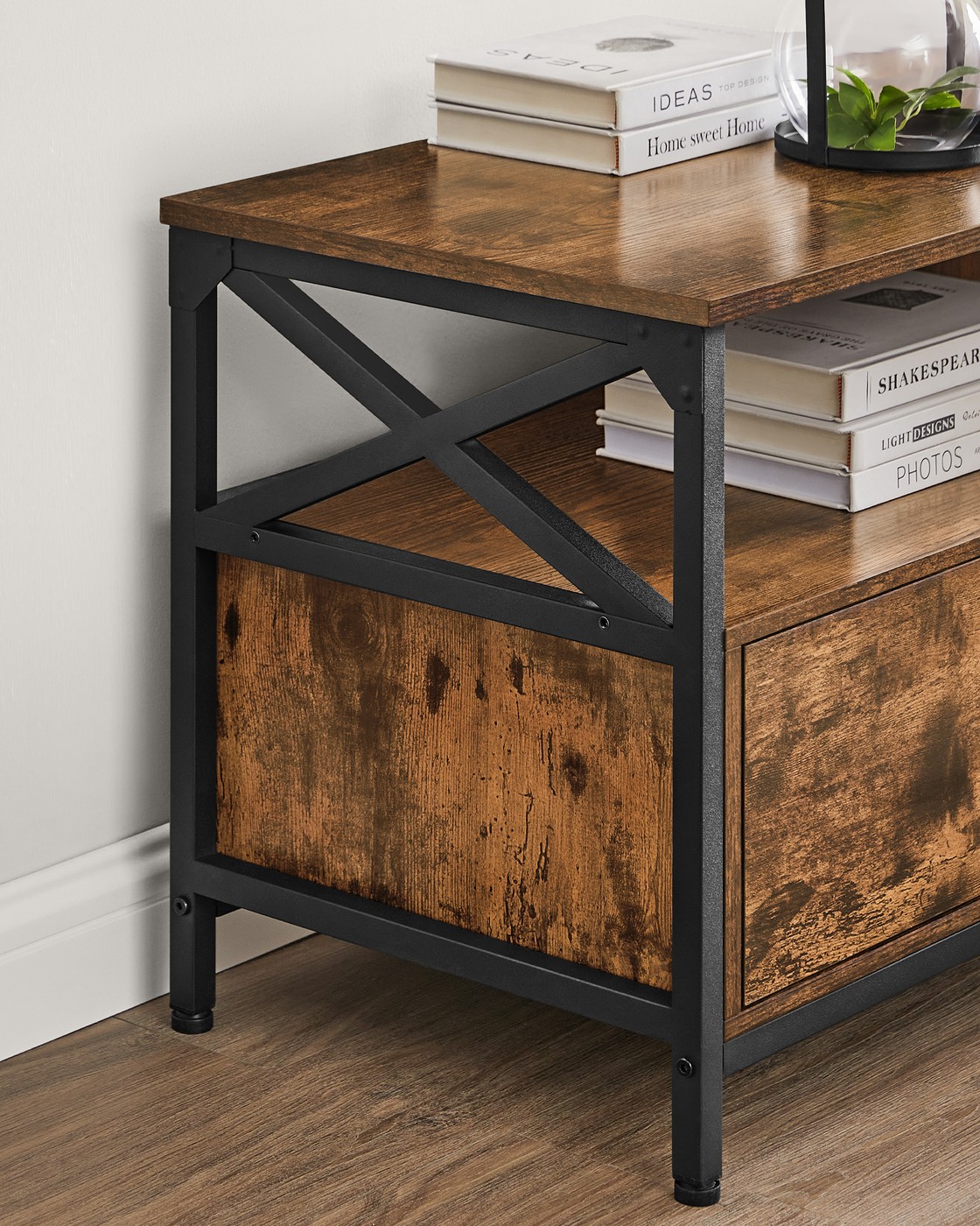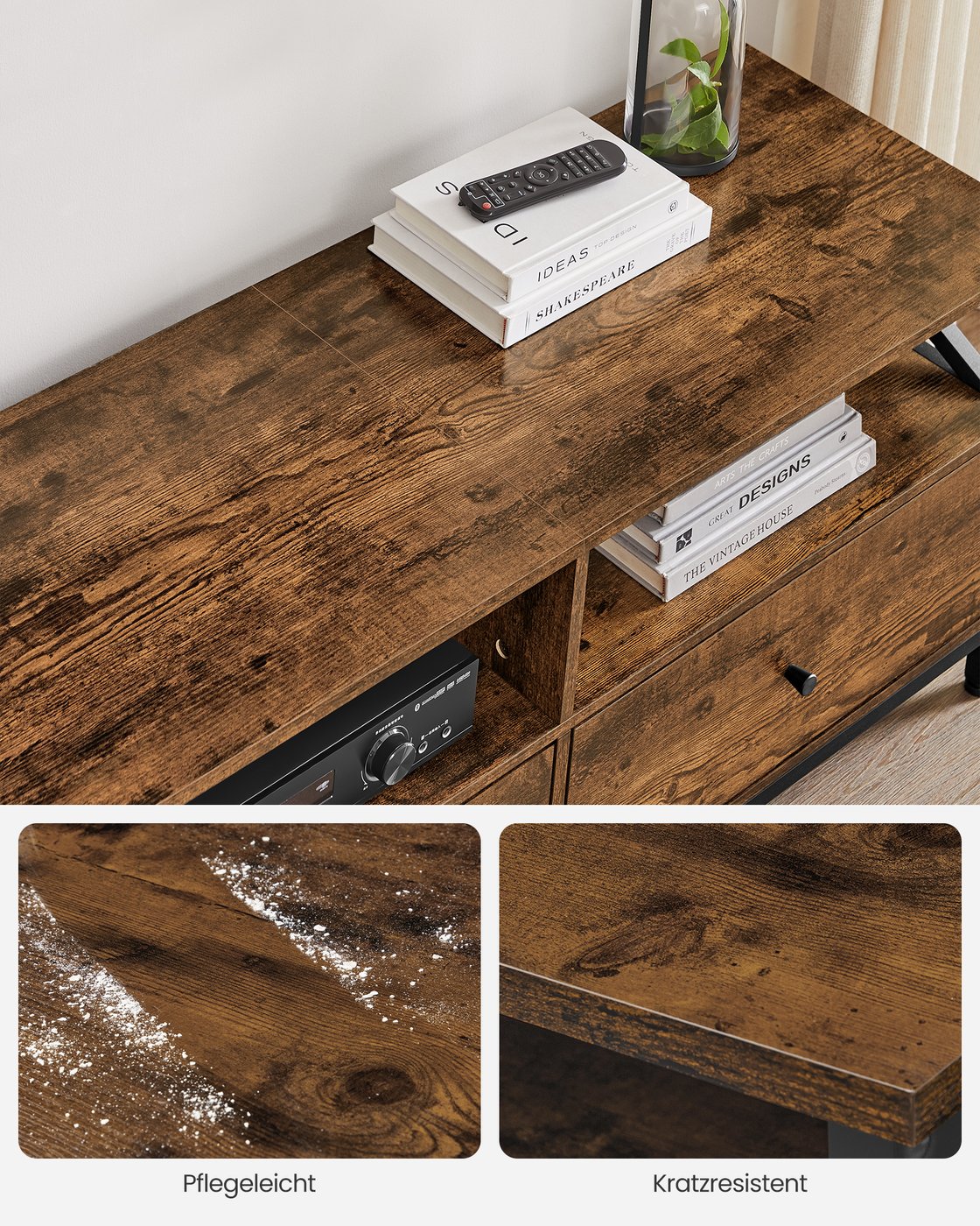 Platus viršus suteikia pakankamai vietos televizoriui ir papildomiems įrenginiams. Tvirta konstrukcija iš metalo ir medžio drožlių plokštės užtikrina stabilumą ir ilgaamžiškumą, o reguliuojamos kojelės leidžia išlyginti spintelę ant nelygių grindų.