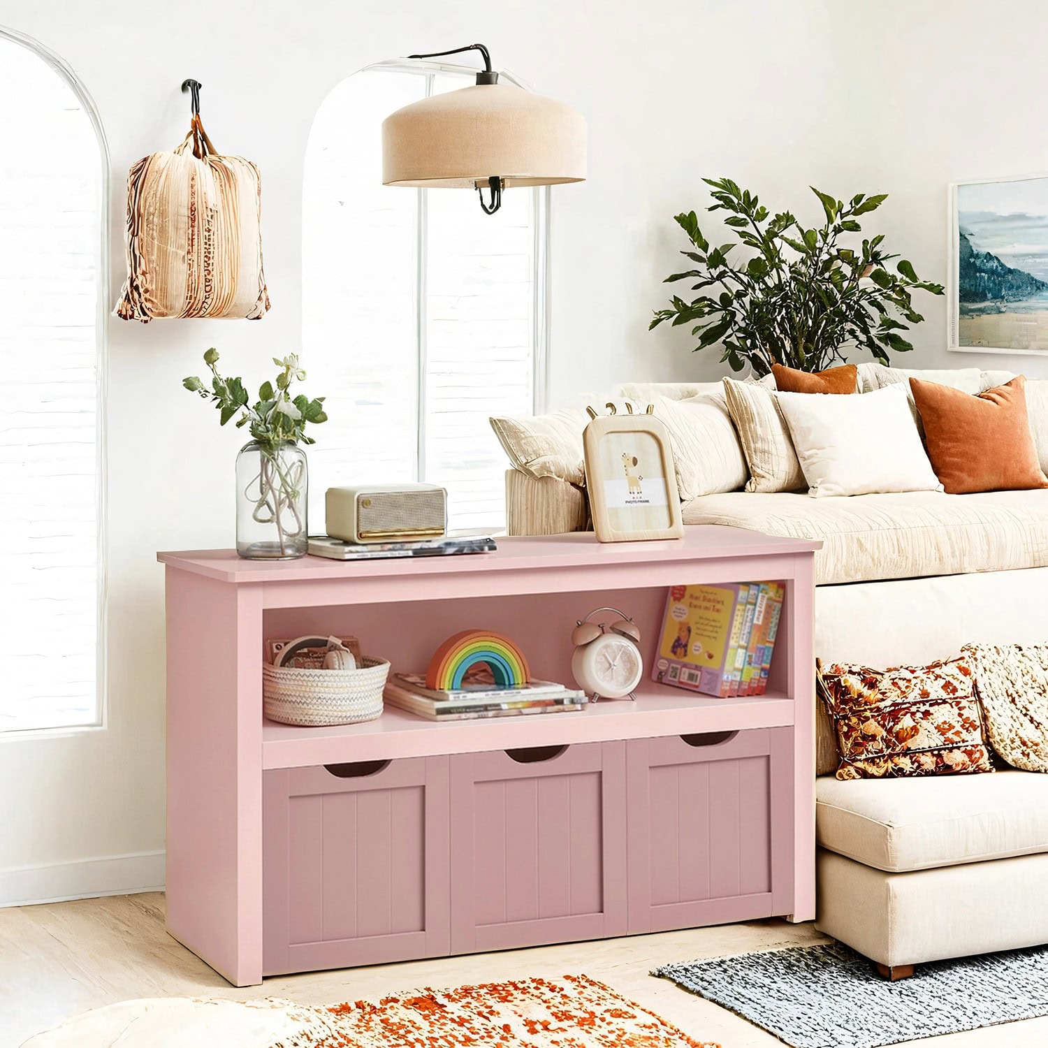 Ši vaikiška lentyna padeda sukurti tvarkingą ir žaismingą erdvę jūsų namuose. Jos švelni pastelinė rožinė spalva bei apgalvotas dizainas puikiai dera tiek vaikų kambaryje, tiek svetainėje ar miegamajame. Vaikams pritaikytas 60 cm aukštis leidžia lengvai pasiekti žaislus, o trys mobilios dėžės su ratukais užtikrina paprastą naudojimą. Lentyna turi viršutinę lentynėlę, atvirą skyrių ir tris talpias dėžes – vietos užteks tiek knygoms, tiek lėlėms, tiek kaladėlėms. Kokybiškos MDF ir metalo medžiagos užtikrina stabilumą bei ilgaamžiškumą. Surinkimas paprastas ir aiškus – idealiai tinka užimtiems tėvams.
