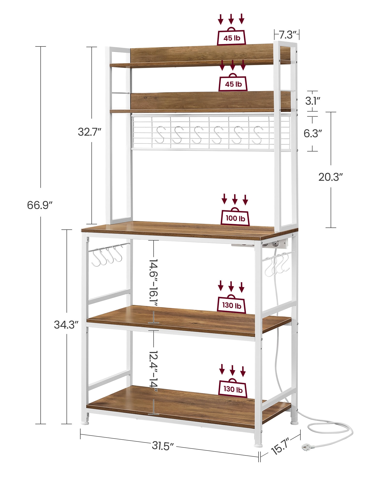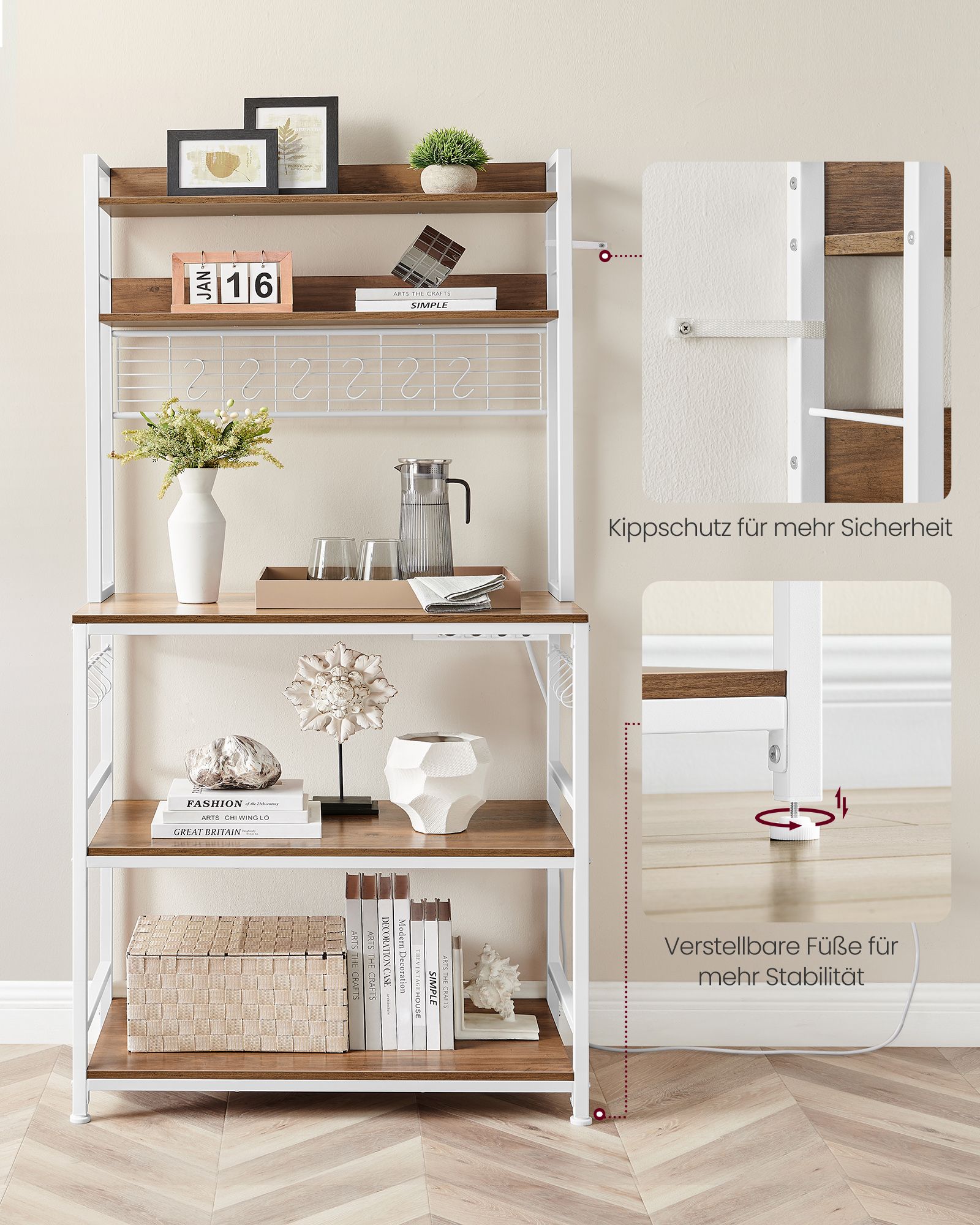 Ieškote funkcionalios ir stilingos lentynos, kuri ne tik padės palaikyti tvarką, bet ir papildys virtuvės interjerą? Ši vintažinio stiliaus virtuvės lentyna su 5 lygiais, 14 kabliukų ir integruotu 4 lizdų ilgintuvu yra puikus sprendimas moderniems ir kaimiško stiliaus namams. Reguliuojama vidurinė lentyna leidžia pritaikyti erdvę pagal įrenginių dydį, o tvirtas baltas plieninis rėmas užtikrina stabilumą. Ši lentyna skirta ne tik mikrobangų krosnelei ar kavai, bet ir organizuotam prietaisų laikymui – nuo gruzdintuvės iki trintuvo.