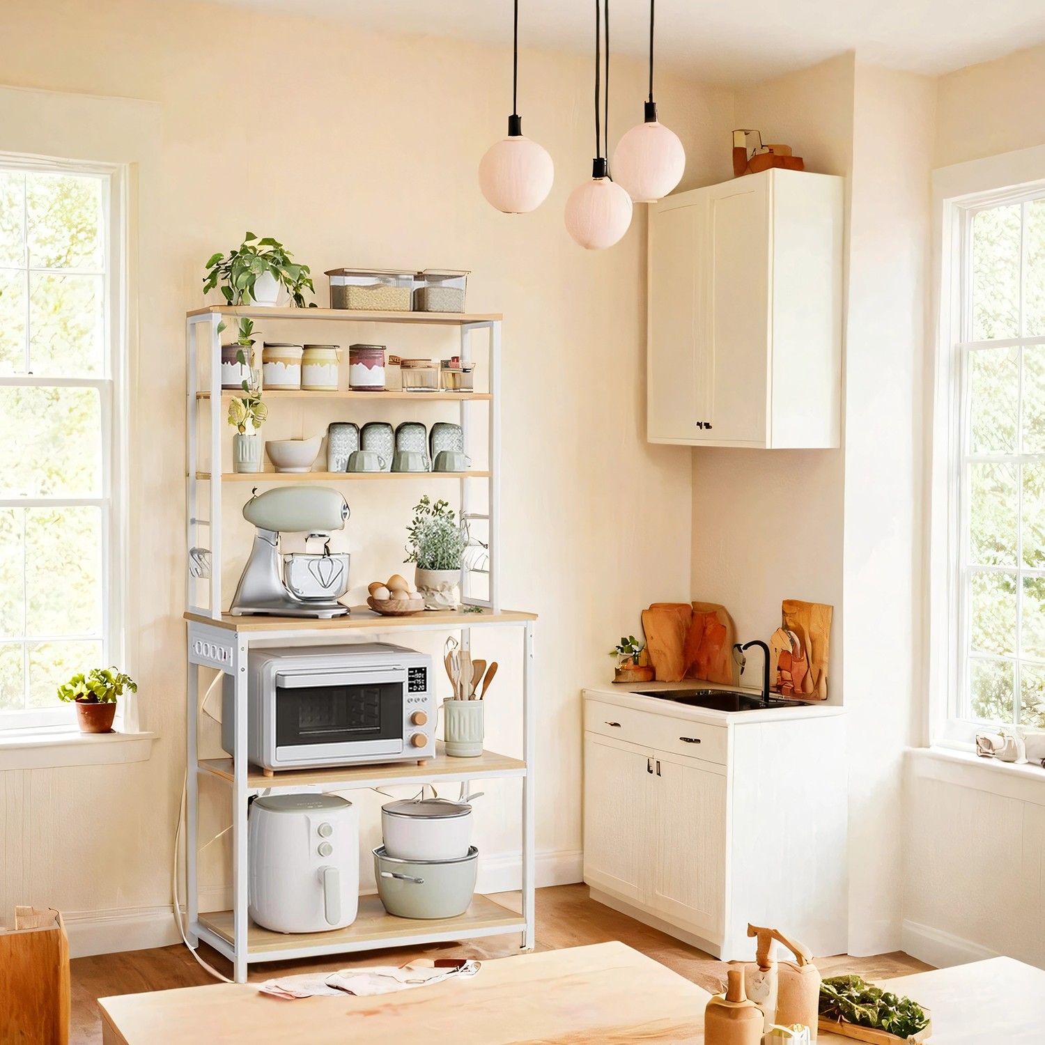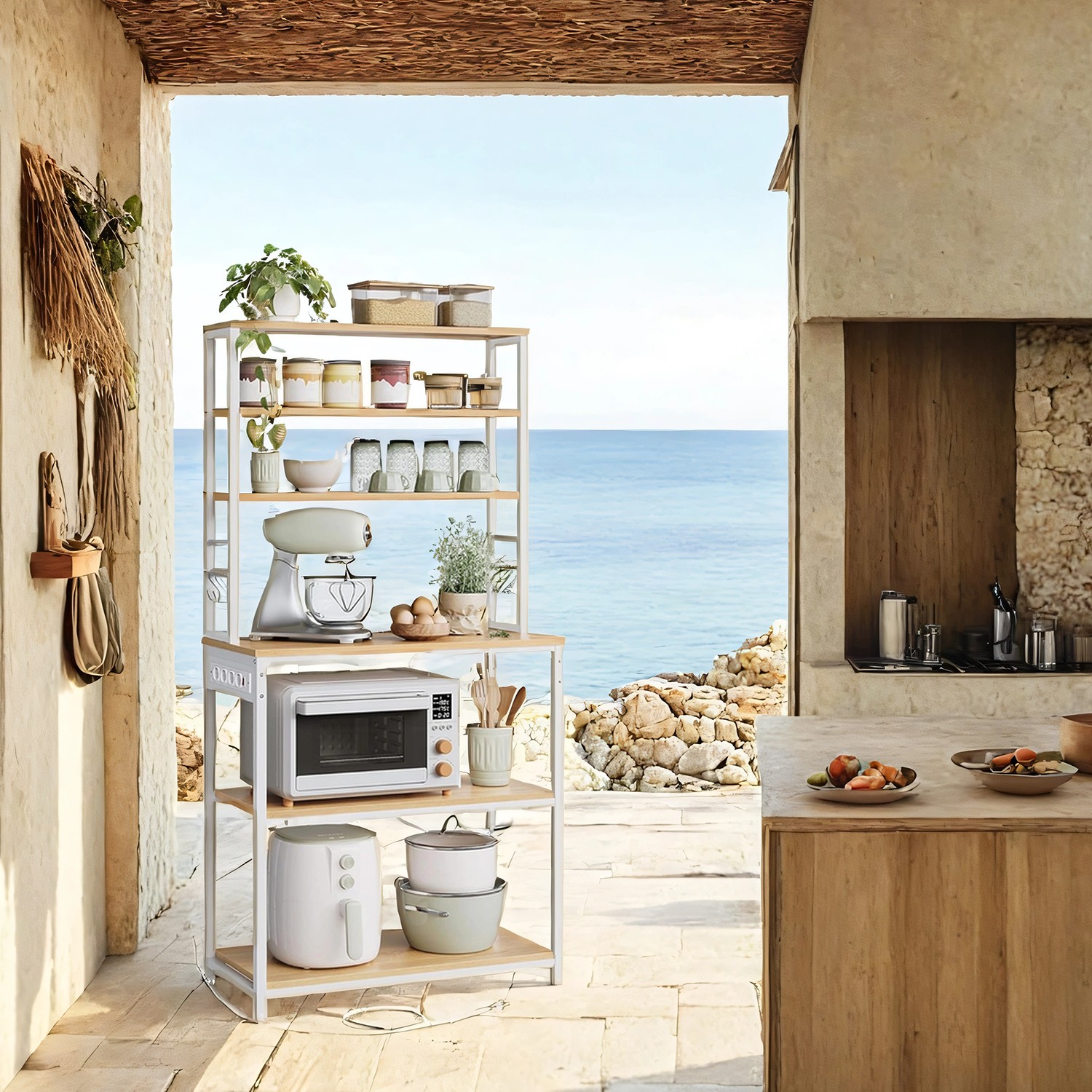 Ši erdvi virtuvės lentyna padeda efektyviai išnaudoti vertikalią erdvę ir palaikyti tvarką. Viršuje yra 3 lentynos prieskoniams, apačioje – 3 didelės lentynos virtuvės įrankiams ir 6 S formos kabliukai. Vidurinė apatinė lentyna yra reguliuojamo aukščio, todėl lengvai pritaikoma tiek mažiems, tiek didesniems prietaisams.