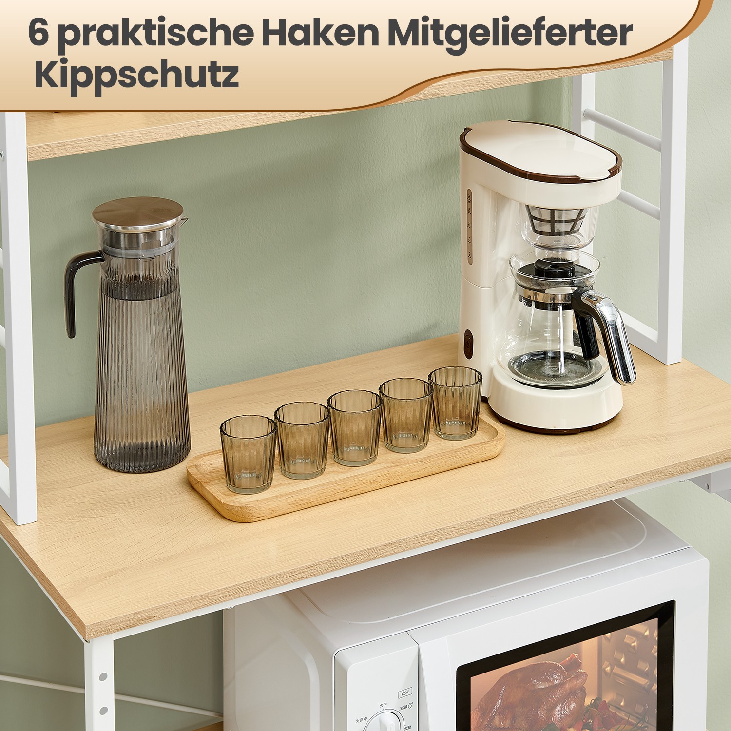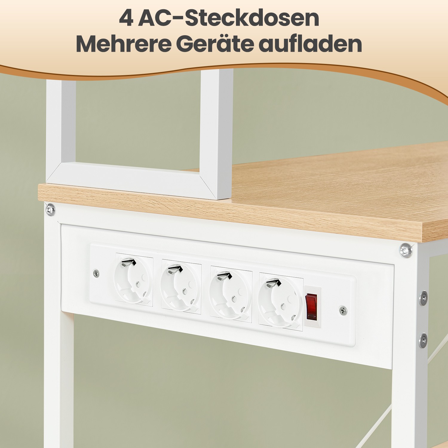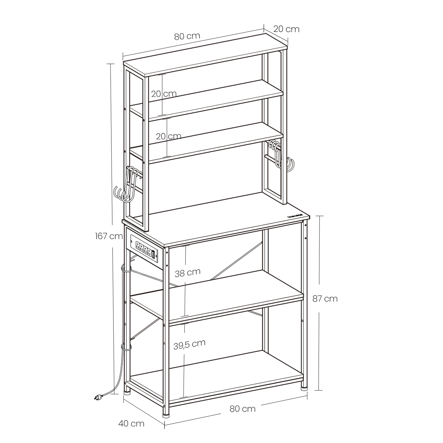Tvirtas plieninis rėmas ir patvari medžio drožlių plokštė suteikia konstrukcijai stabilumo, todėl lentyna lengvai išlaiko mikrobangų krosnelę, kavos aparatą ar kitą techniką. 40 x 80 x 167 cm dydis puikiai tinka mažoms virtuvėms, o integruoti 4 elektros lizdai suteikia daugiau patogumo – lentyną galite naudoti ir kaip mini kavos barą. Reguliuojamos kojelės apsaugo grindis nuo įbrėžimų, o apsauga nuo apvirtimo leidžia saugiai pritvirtinti lentyną prie sienos.