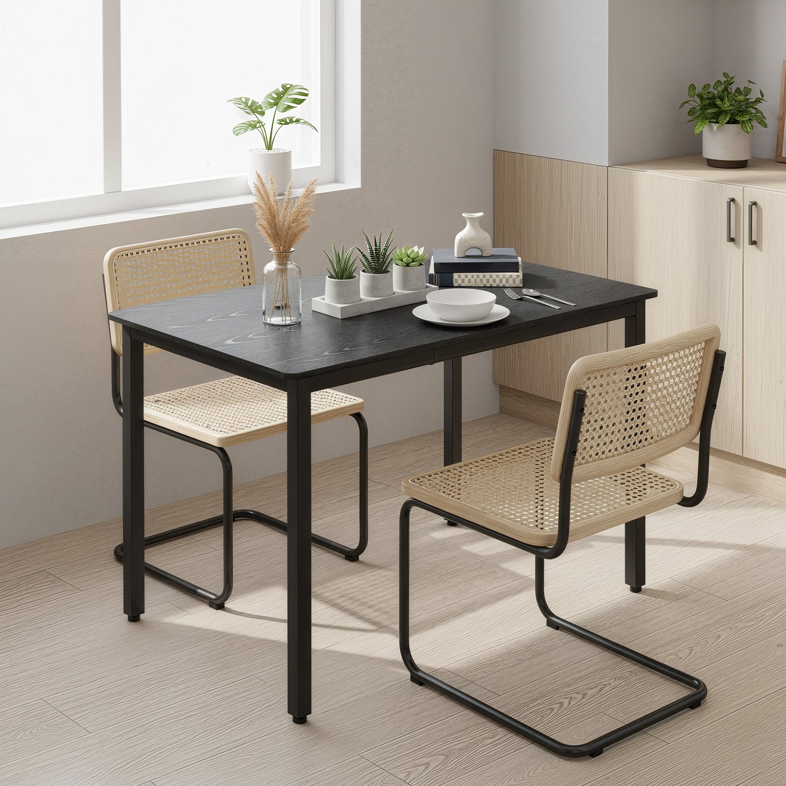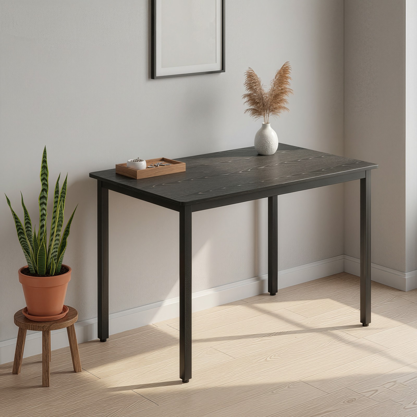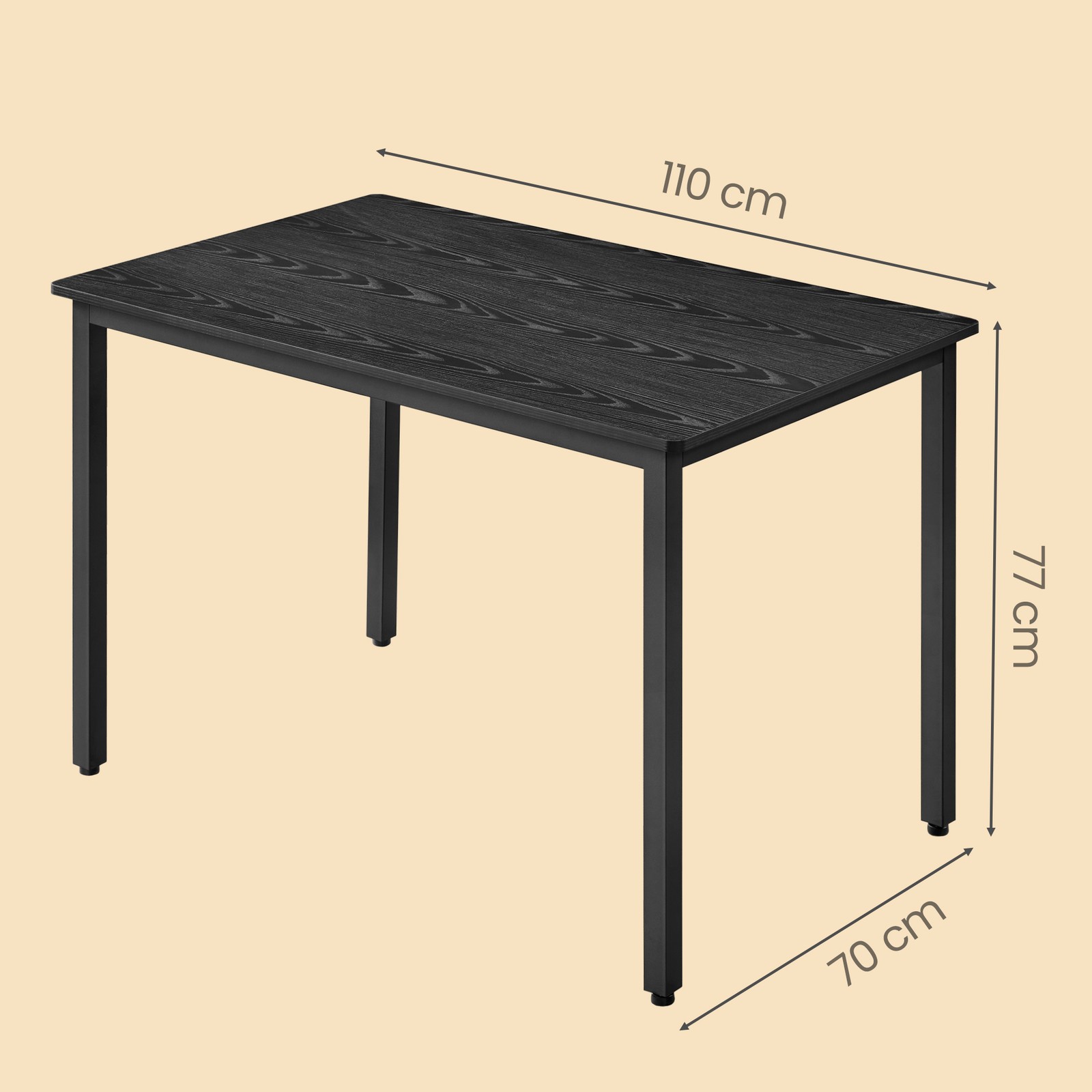 Kompaktiškas stalas suteikia pakankamai vietos patogiems pietums keturiems asmenims. Medžio tekstūros paviršiaus ir juodo plieno derinys sukuria modernų pramoninį įvaizdį, tinkantį įvairioms erdvėms – virtuvei, valgomajam, svetainei ar net kavinei. Tvirta konstrukcija iš aukštos kokybės medžiagų užtikrina stabilumą ir ilgaamžiškumą kasdieniam naudojimui. Aiškios instrukcijos ir pažymėtos dalys leidžia stalą greitai ir lengvai surinkti.