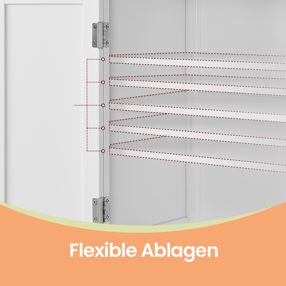 Viduje esančios reguliuojamo aukščio lentynos leidžia patogiai laikyti įvairaus dydžio daiktus. Spintelė pagaminta iš patvarios MDF plokštės, turi apsaugą nuo apvirtimo ir suapvalintus kampus, užtikrinančius saugumą.