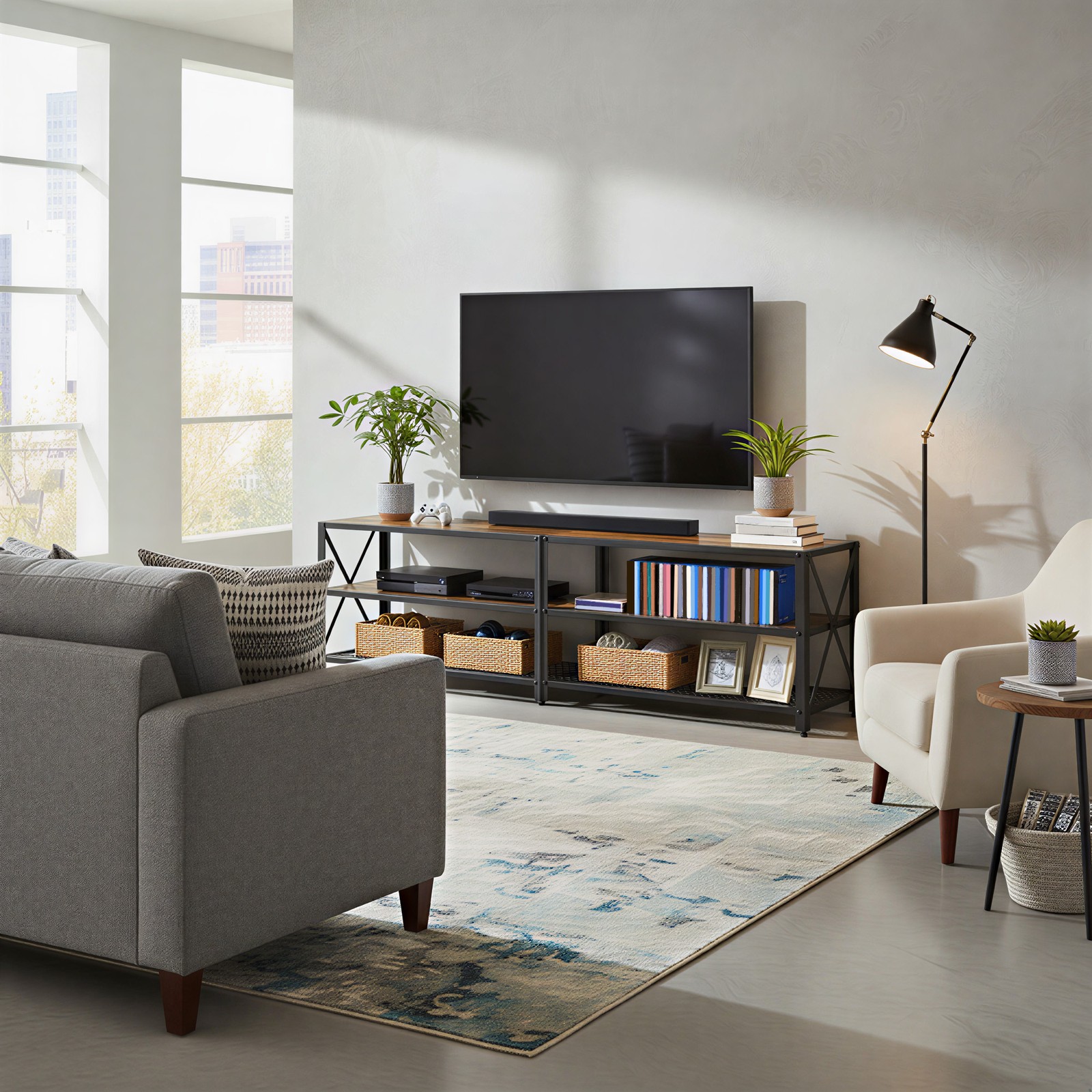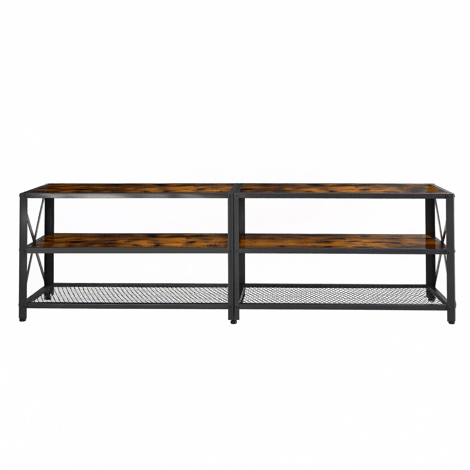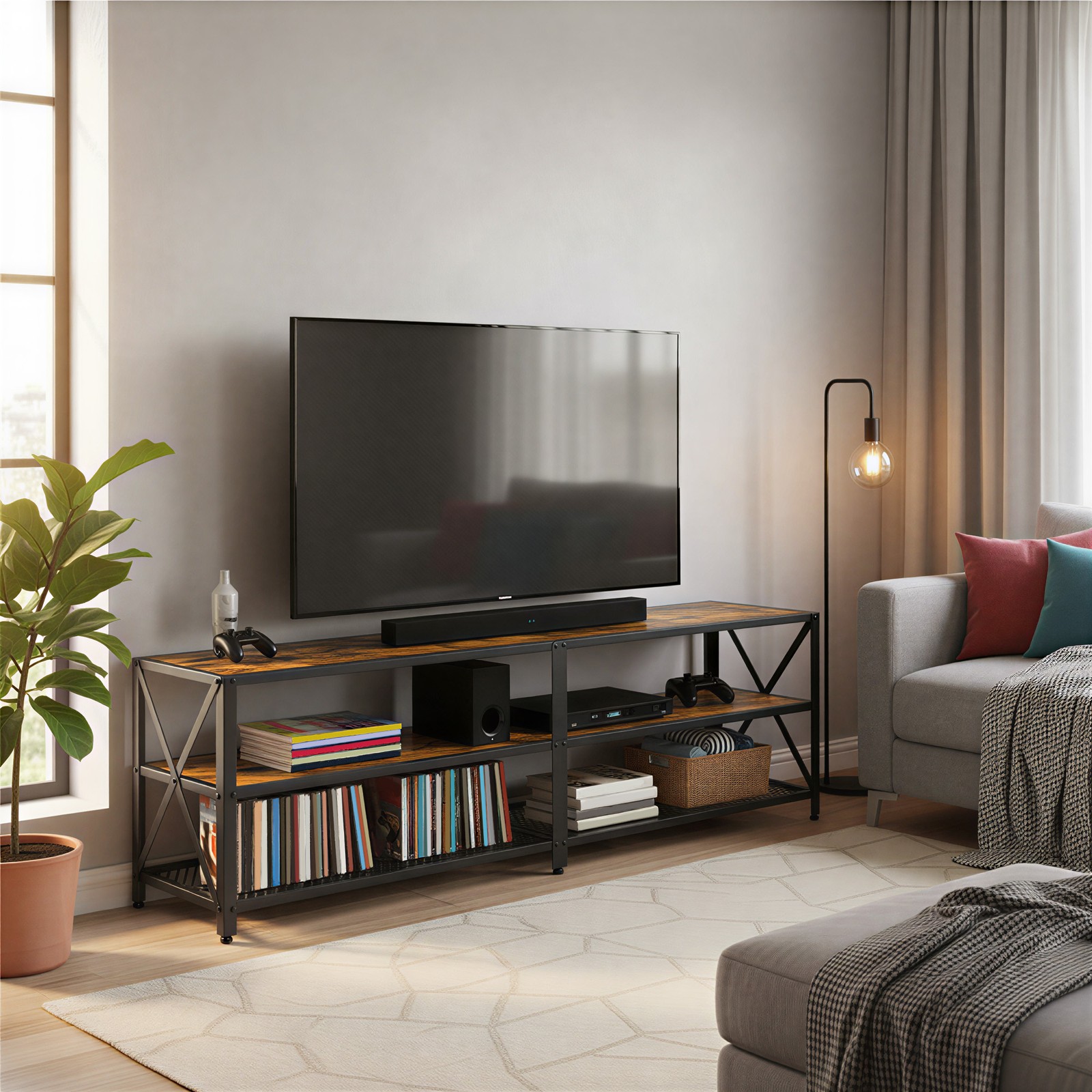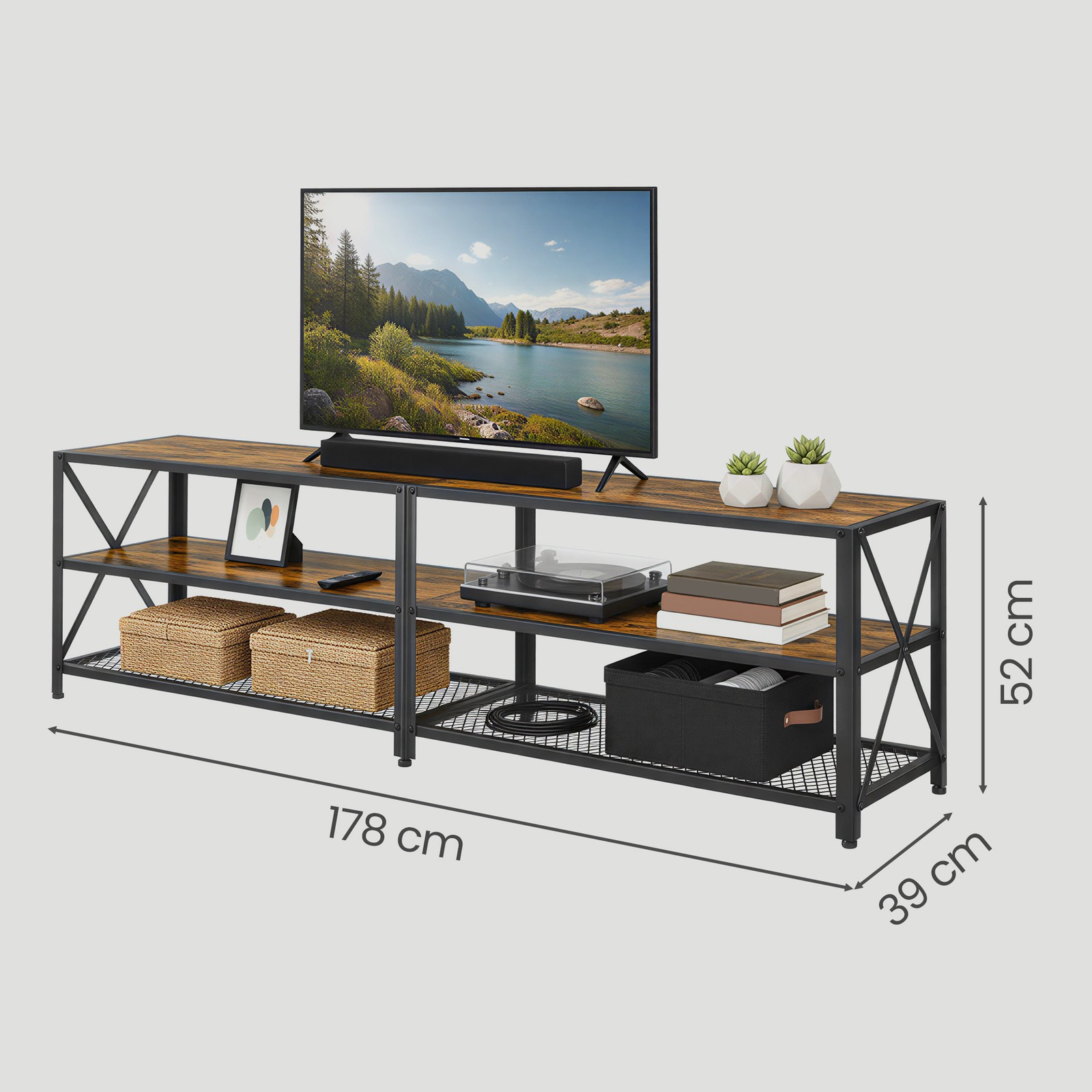 Stilingas ir talpus TV staliukas, skirtas dideliems televizoriams ir moderniam interjerui. Platus 178 cm paviršius suteikia vietos televizoriui ir dekoracijoms, o trys atviri lygiai leidžia tvarkingai laikyti konsoles, knygas ir kitus daiktus. Tvirtos plieninės kojelės su X formos atramomis ir reguliuojamomis pėdutėmis užtikrina stabilumą. Industrinio stiliaus medžio ir metalo derinys suteikia namams modernų charakterį, o paprastas surinkimas leidžia greitai pradėti naudotis.