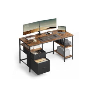 Kompiuterio stalas su 3 lentynomis ir 2 stalčiais, vintažinis rudas–juodas