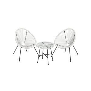 Baltas sodo-balkono baldų rinkinys su PE rotango kėdėmis ir grūdinto stiklo staliuku
