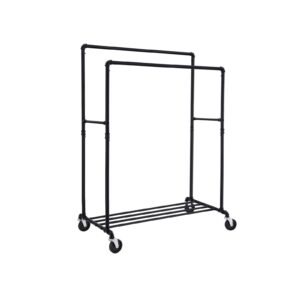 Drabužių kabykla su ratukais industrinė juoda dviejų vamzdžių
